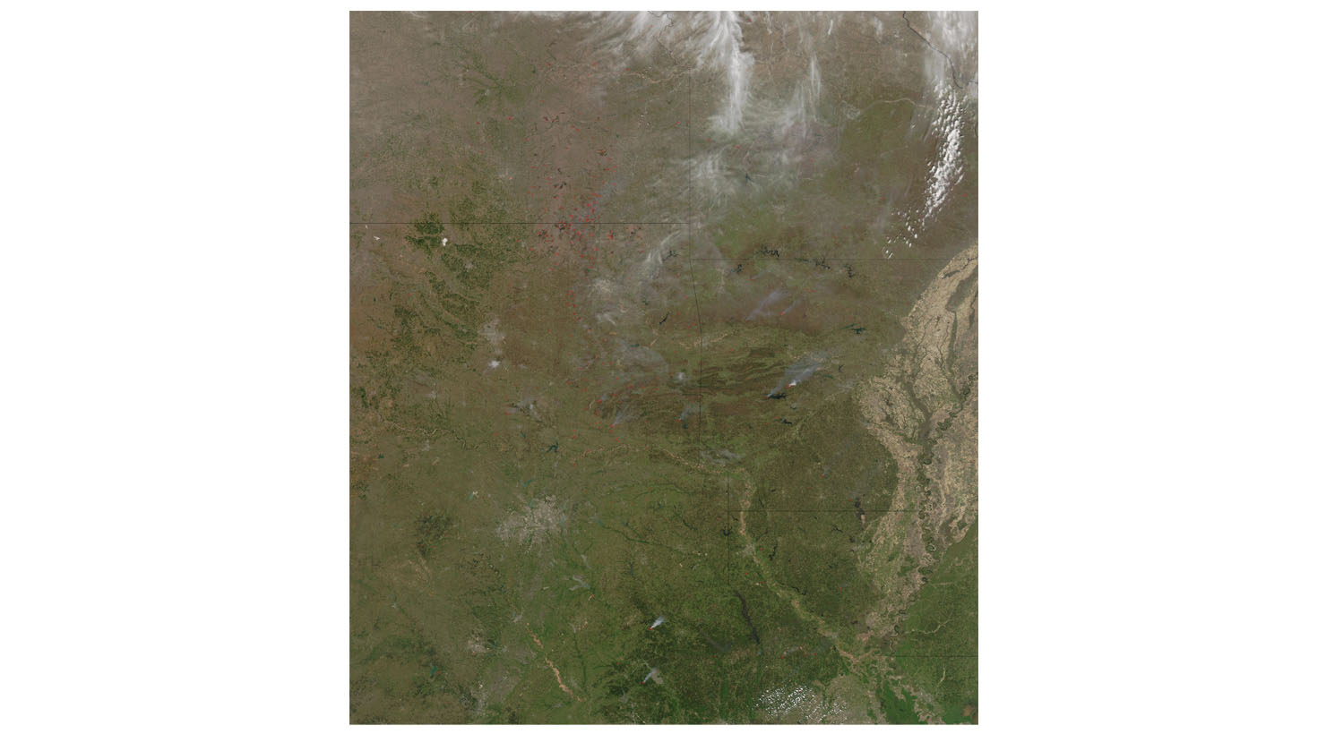 Fires in Southcentral United States. On March 31, 2003, the Moderate Resolution Imaging Spectroradiometer (MODIS) on the Aqua satellite detected numerous fires (red dots) burning in the central United States. States shown are (top left to bottom) Kansas, Oklahoma, and Texas; (center, top to bottom), Missouri, Arkansas, and Louisiana; Illinois (far top right) and Mississippi (bottom right edge.)