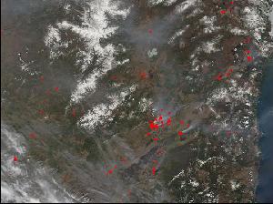 At the southern end of the West Siberia Plain, several large and smoky fires in southern siberia were burning in the area around Novosibirsk on May 19, 2006. This image of the fires (outlined in red) was captured by the MODIS on NASA’s Terra satellite. According to news reports, May 2006 has been hot and dry, with accompanying high fire danger. The West Siberia Plain is a wet region, and it has large amounts of peat. Peat fires can be long-lived and can produce vast amounts of smoke. It is possible that some of the large, smoky fires seen in this image are peat fires.