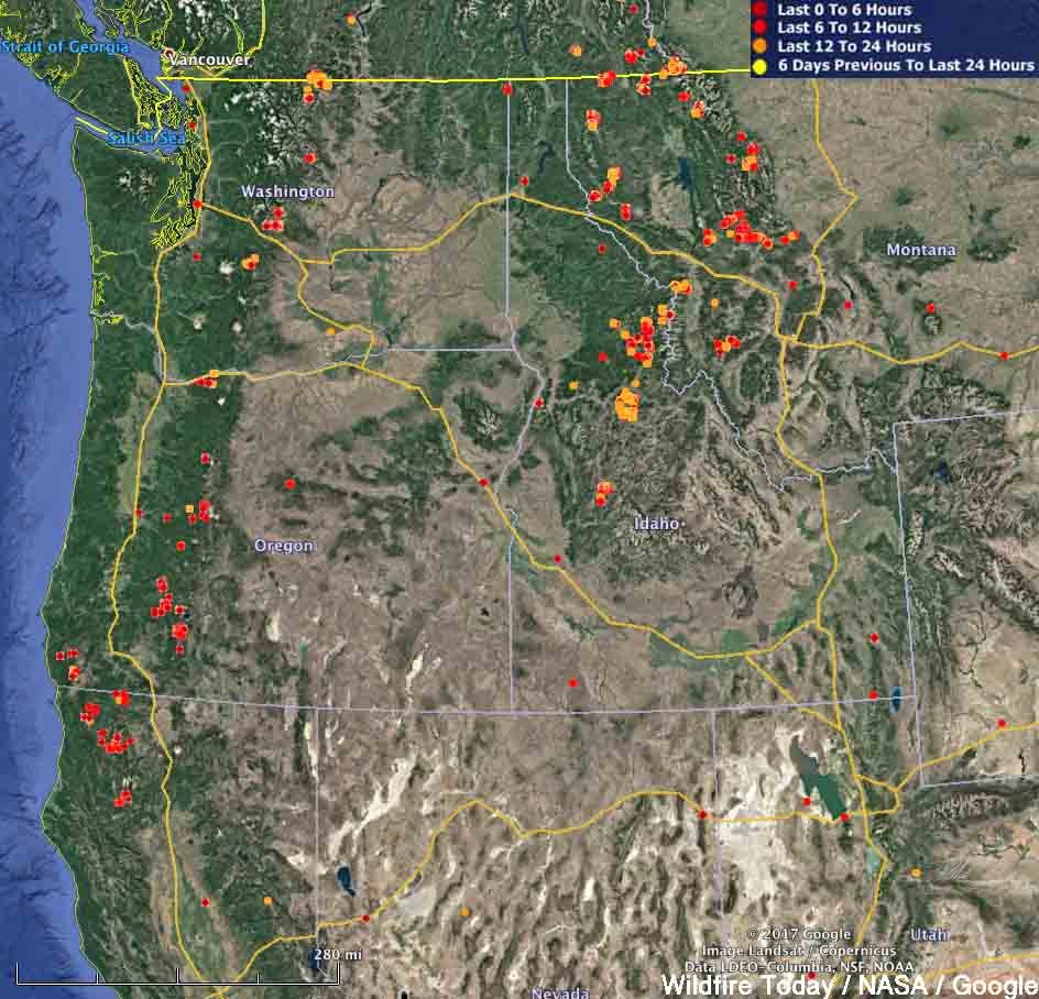 Fires in the Northern Rockies. Dozens of fires burning in the Rocky Mountains in Montana were detected by the Moderate Resolution Imaging Spectroradiometer. (MODIS) On the Aqua satellite on the afternoon of August 19, 2003. Therefore In the image, fire locations have been marked in yellow. The fires are threatening power transmission lines. Therefore many residents have been told to prepare for blackouts as other residents are being evacuated.