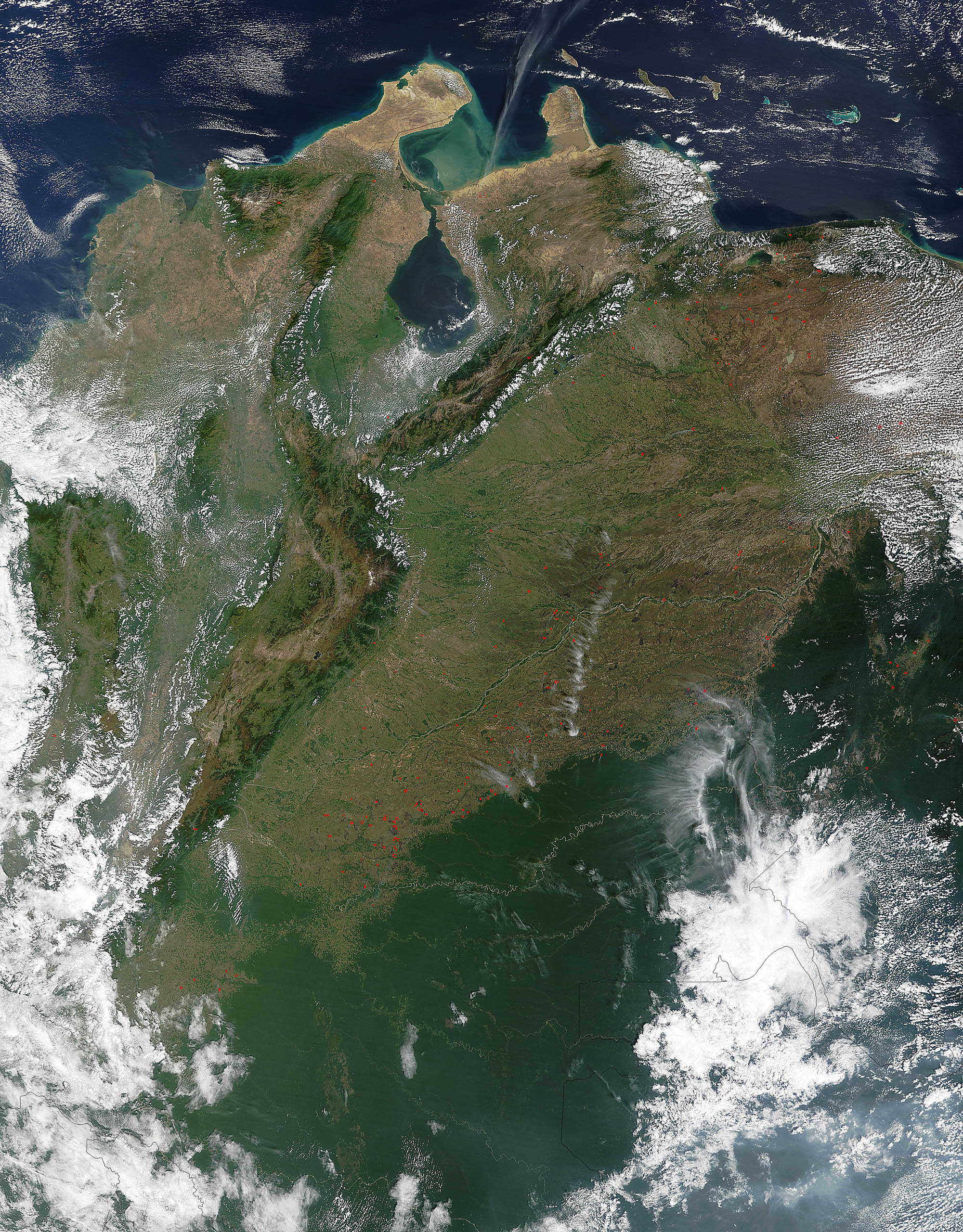 Fires In Venezuela And Colombia. Dozens of fires speckled the landscape of Columbia (west) and Venezuela (east) in mid-January 2016. The Moderate Resolution Imaging Spectroradiometer (MODIS) aboard NASA’s Terra satellite captured this true-color image of the scene on January 17.