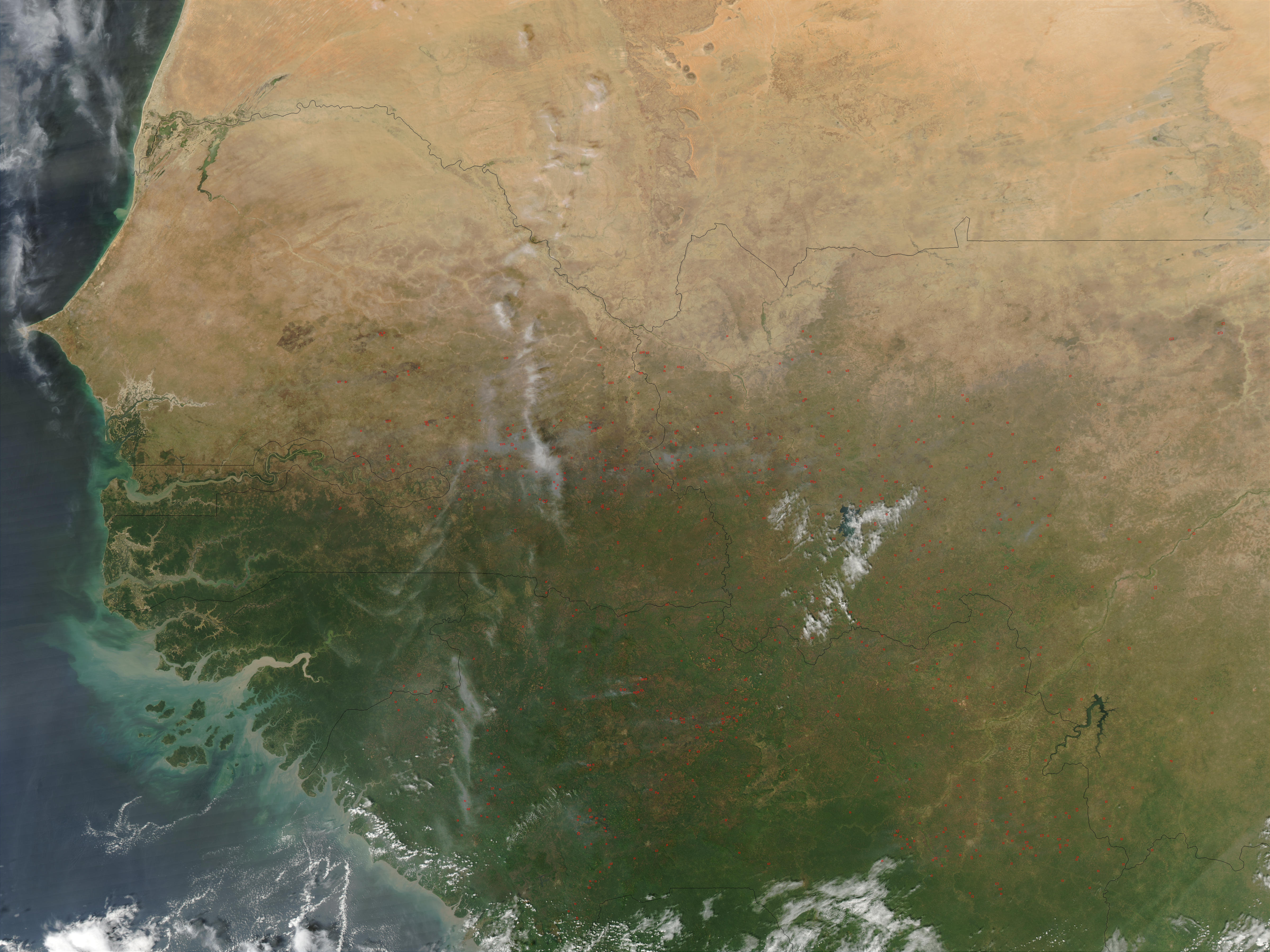The Fires in western Africa, the Sahara desert (top, in Mauritania) blends with a loosely defined strip of transitional vegetation to the south, called the Sahel (lighter green). South of the Sahel, tropical savannas begin to dominate (darker green). This true-color Moderate Resolution Imaging Spectroradiometer (MODIS) image from the Aqua satellite shows fires (red dots) burning in the Sahel in northern Senegal (left center) and Mali (right center). To the south, fires are also burning in the savannas of Guinea. This image was acquired on November 9, 2002. The fires in western Africa.