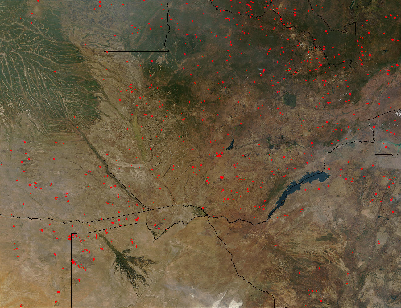 Fires in Zambia. This series of true-color Moderate Resolution Imaging Spectroradiometer (MODIS) images was captured by the Aqua satellite. The images are generally centered on the African country of Mozambique, and highlight the widespread extent of the burning season in the region. (Fires are marked with red dots). The series begins in early September and runs through late October 2002.