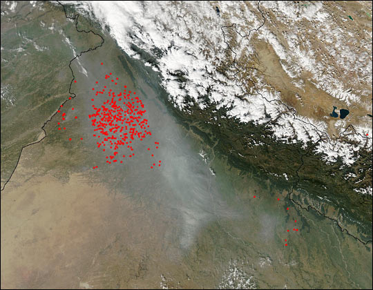 Fires Near Indus River Ongoing fires in northwest India contribute to a pall of haze that stretches eastward along the foothills of the Himalayas on October 22, 2002. In this true-color image from the Moderate Resolution Imaging Spectroradiometer on the Aqua satellite, fires are marked with red dots.