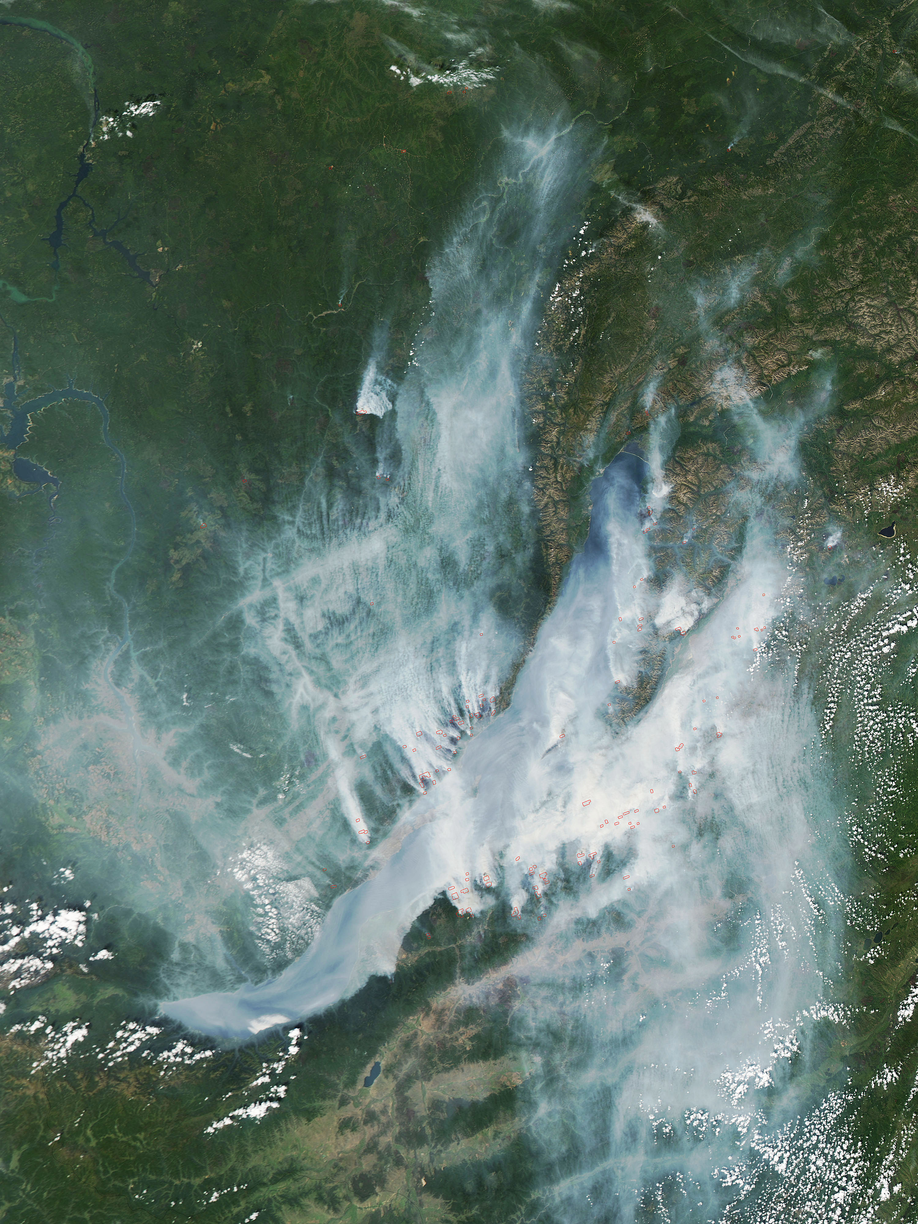 Fires continued to burn in south-east Siberia in late August, 2015, consuming thousands of hectares of forests and grasslands while emitting billowing clouds of smoke into the atmosphere. Fires Near Lake Baikal, Russia.