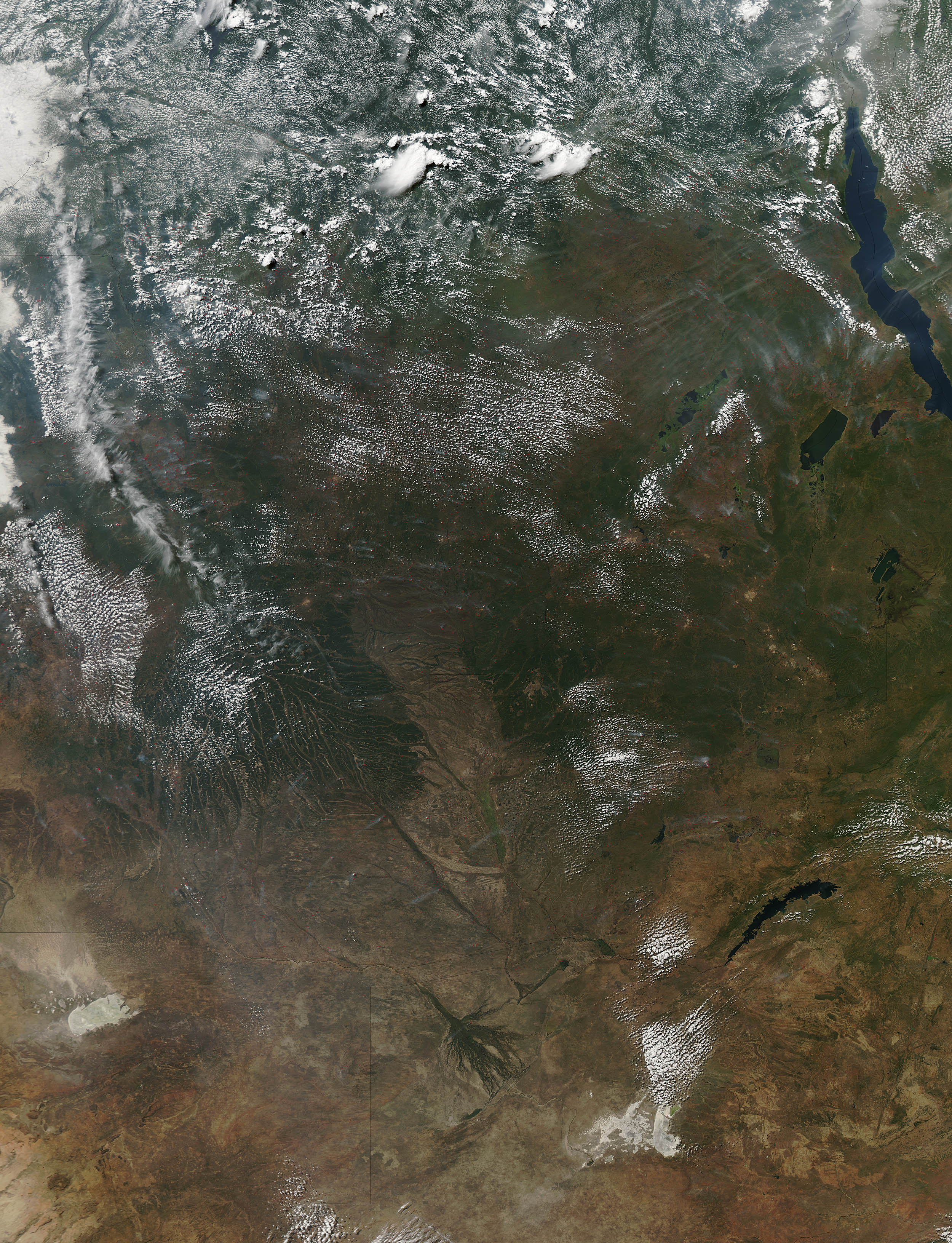 The widespread nature of the fires, their location (generally located away from forests, which appear deeper green), and the time of year suggest that these fires were set intentionally for agricultural purposes. Though not immediately hazardous, such large-scale burning can have a strong impact on weather, climate, human health, and natural resources.
