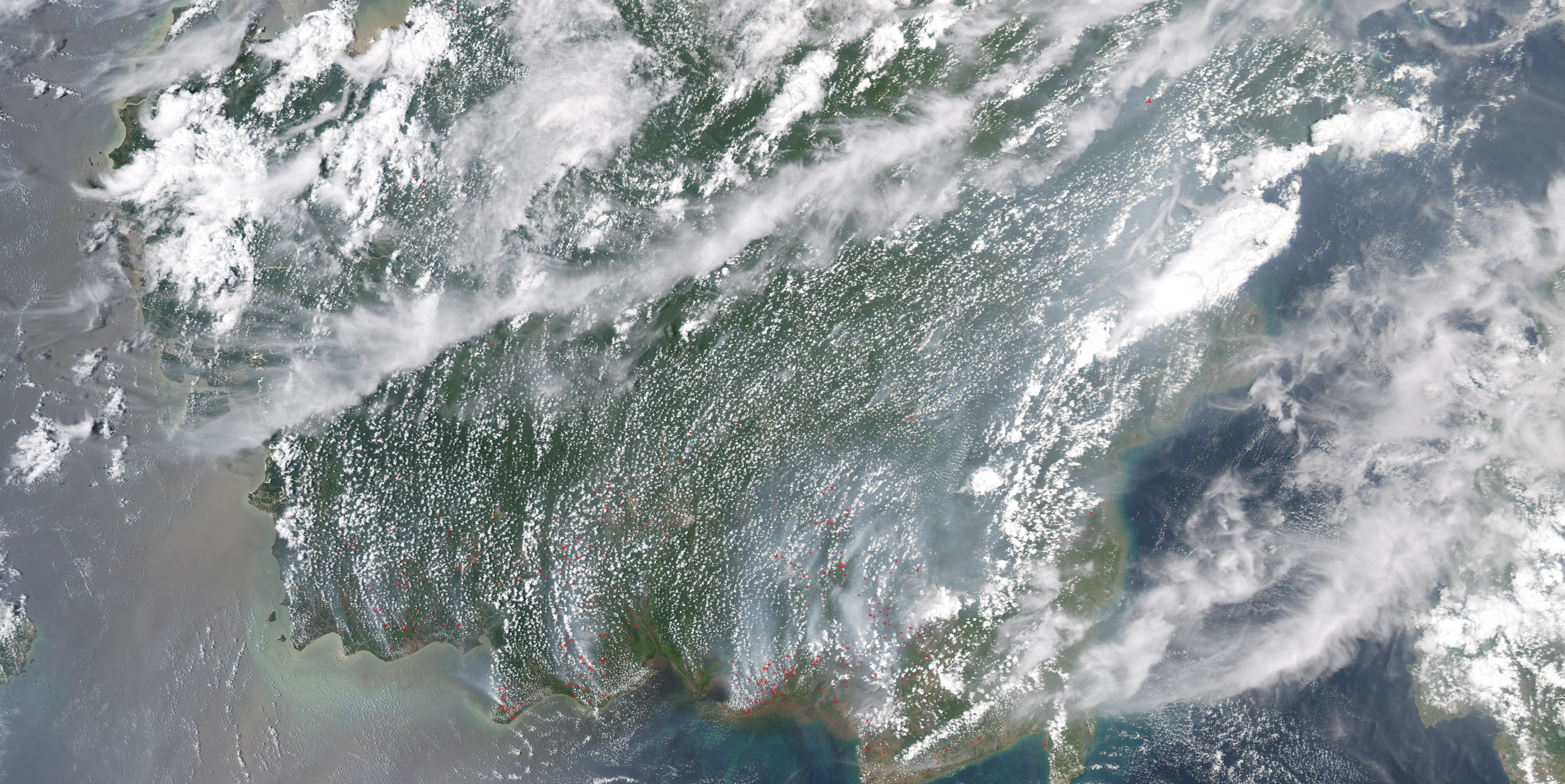Fires on Borneo and Sumatra. On August 10, 2004, scores of fires were burning across the island of Borneo. Fires were burning in the Sarawak region of Malaysia, which occupies the northern part of the island, as well as the Kalimantan region of Indonesia, which occupies the southern part. Fires are especially concentrated in the West, around the coastal city of Sinkawang (lighter green area south of the western tip of the island). The Moderate Resolution Imaging Spectroradiometer (MODIS) on NASA’s Aqua satellite captured this image as well the location of active fires (marked in red). The high-resolution image provided above is 500 meters per pixel. The MODIS Rapid Response System provides this image at additional resolutions.
