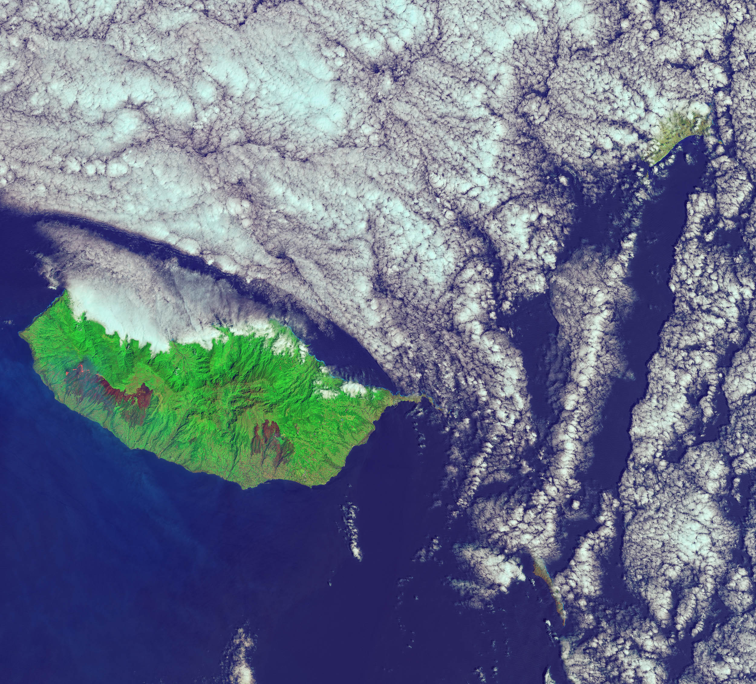 When the Operational Land Imager (OLI) on the Landsat 8 satellite captured this image of Madeira on August 11, 2016, a large fire on the western side of the island was still burning. A burn scar to the southeast extends into the outskirts of Funchal, Madeira’s largest city.