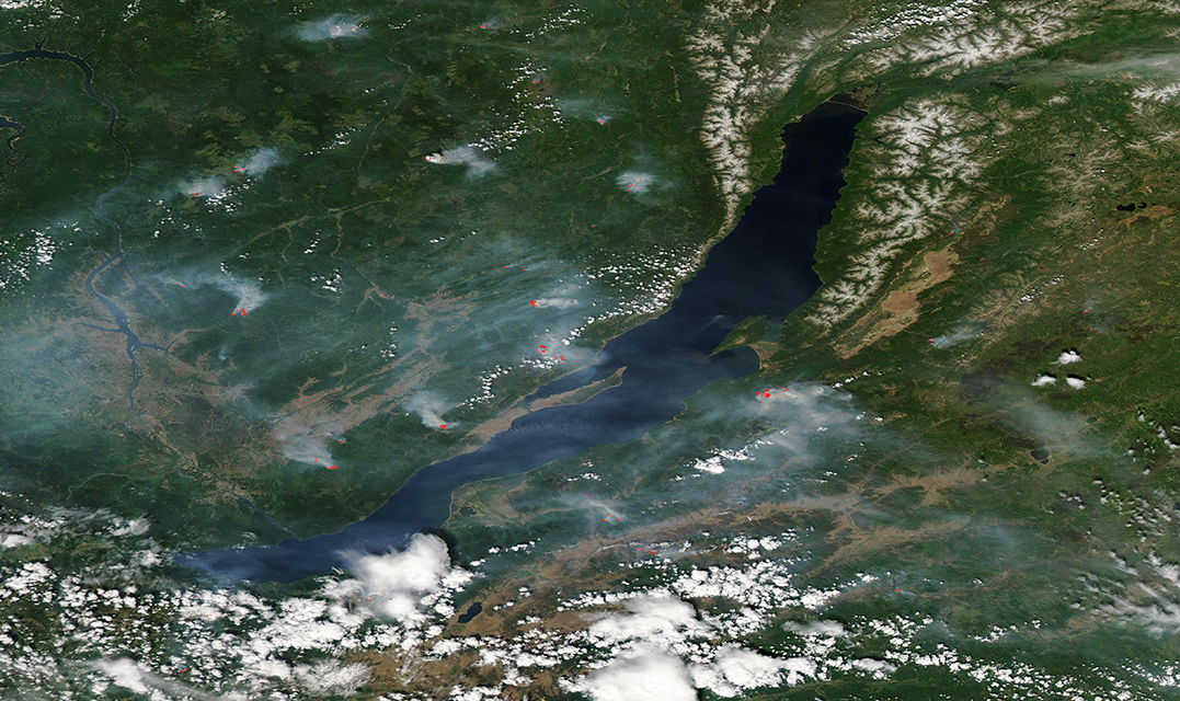Fires Surrounding Lake Baikal. Hundreds of forest fires continue to burn across the boreal forests of Russia, releasing thick clouds of smoke that are spreading as far south as South Korea and central China. This Moderate Resolution Imaging Spectroradiometer (MODIS) from the Aqua satellite on May 20, 2003, shows the fires marked with red dots.