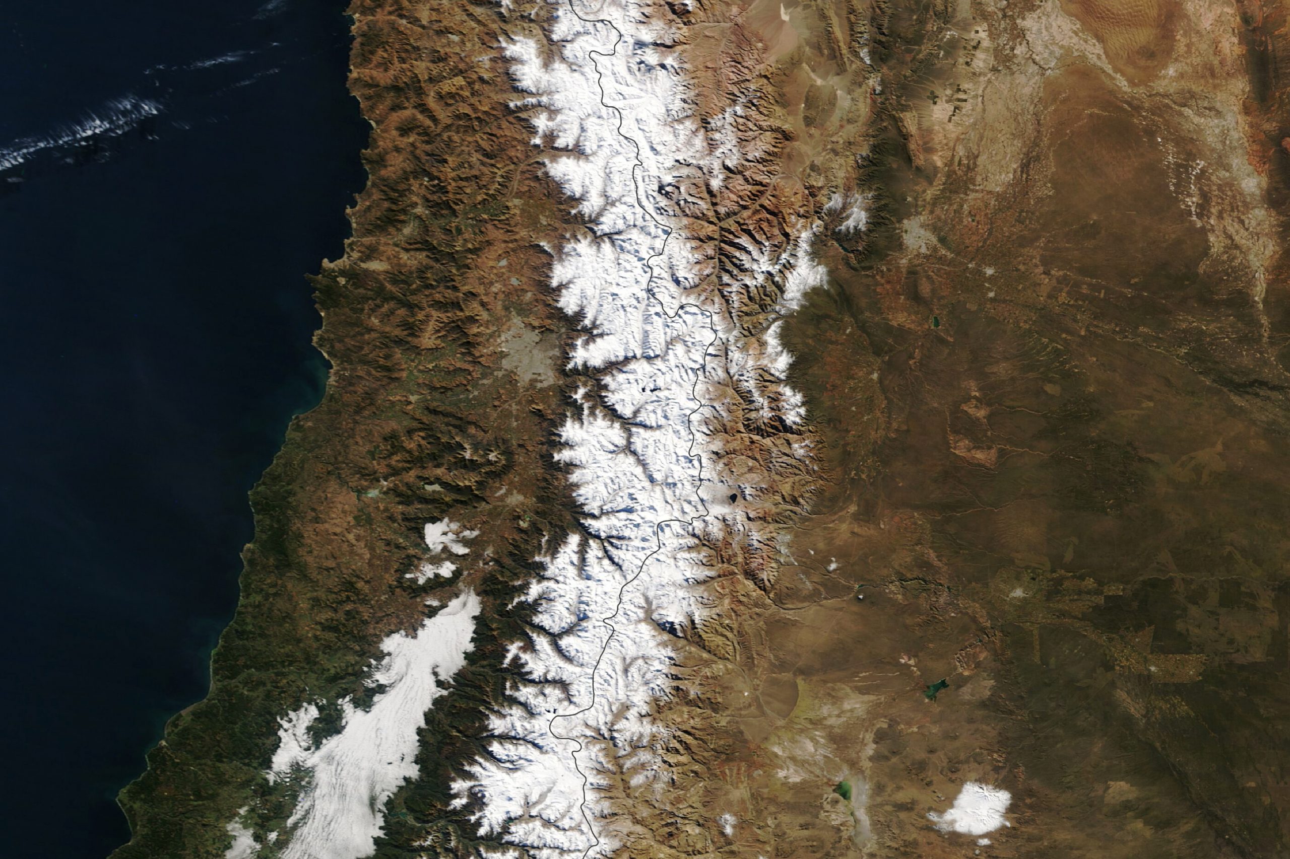Today’s Image of the Day from NASA Earth Observatory features the first major snowstorm of fall 2021 in South America. The photograph captures snow on the Andes Mountains near central Chile and Argentina.