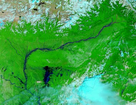 Northeastern flooding in Bangladesh disappeared under monsoon floods as rains drenched the region in June 2006. By June 21, when the Moderate Resolution Imaging Spectroradiometer (MODIS) on NASA’s Aqua satellite captured this image, the floods stretched across hundreds of kilometers of what had been dry land a month earlier. You can rollover the image to see an image of the same area aquired on May 22, 2006. According to Reuters, the floods claimed nine lives, made 10,000 homeless, and marooned more than a million by June 18. The monsoon rains typically last from June to September. These satellite images of the floods are shown in infrared to allow water to stand out against the land. Water is black and dark blue. Plant-covered land is green, and clouds are pale blue and white.