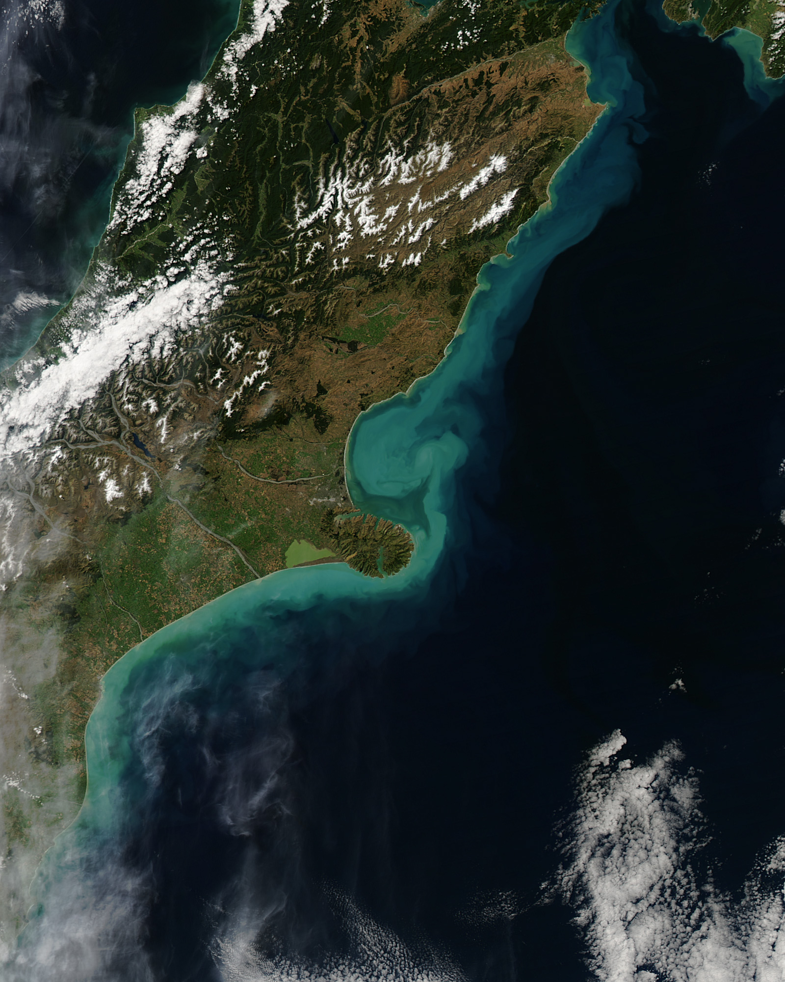 The surge of rainfall caused rivers—including the Waimakariri, Rakaia, Heathcote, and Avon—to swell with what appeared to be sediment-rich water. Skies had cleared enough by March 6, 2014, for the Moderate Resolution Imaging Spectroradiometer (MODIS) on NASA’s Aqua satellite to acquire this image showing the aftermath. While it’s not possible to make out patches of standing water in Christchurch, the large amount of suspended sediment flowing out from the rivers made dark blue coastal waters appear tan. The aquamarine patterns farther offshore are likely caused by suspended marine-based calcite sediment that was lofted up from the sea bottom by waves produced during the storm.