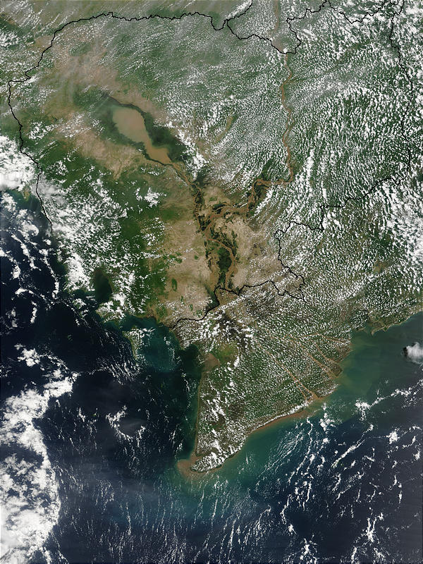 This series of Terrand And Aqua MODIS images from August 2002 shows flooding in the Mekong River Delta in southeast Asia. Therefore In the false-color images black represents open water. As well as green represents land, cyan represents low-level water clouds, white represents high-level ice clouds. Also bright blue represents flooding in the marshlands. Although Notice that the river outflows into the sea are the same bright blue color as the flooded, inland areas. Therefore That is because in both cases, the color is the result of sunlight inbterating with soil (sediment) and water. In these images from August 1, 28, and 29, 2002, Cambodia is in the image center. And Vietnam is at right.