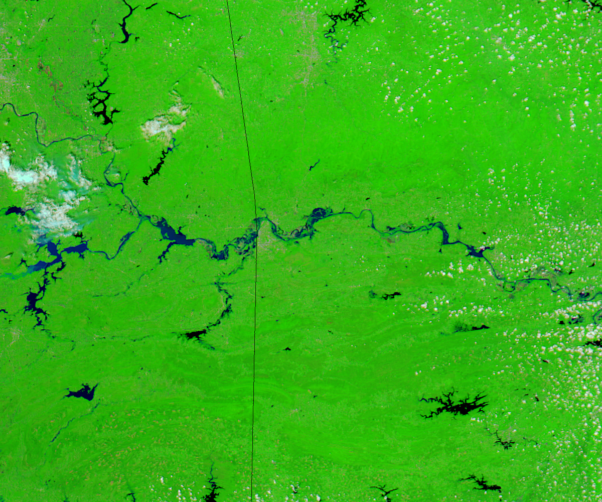 The two false-color satellite images above show the Arkansas River as it runs through Oklahoma and Arkansas. The top image was acquired on May 26, 2015, by the Moderate Resolution Imaging Spectroradiometer (MODIS) on NASA’s Aqua satellite. For comparison, the lower image shows the same area under more typical conditions as observed by MODIS on the Terra satellite on May 14, 2013.