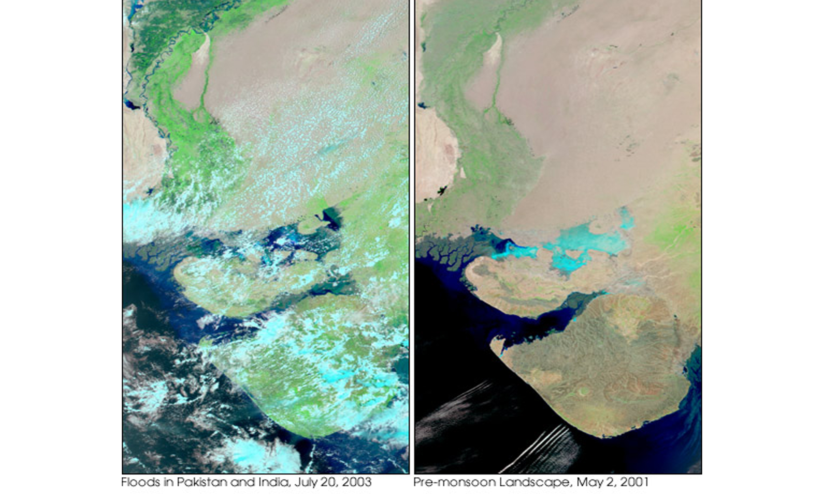 In mid-July, heavy monsoon rains caused major flooding along the Indus River in Southern Pakistan (top left) and in India?s Gujarat Province, which spreads over the two peninsulas in the bottom part of the image. In these false-color images from the Moderate Resolution Imaging Spectroradiometer (MODIS), standing flood waters are dark blue, vegetation is bright green, clouds are light blue, and bare ground is shades of tan and brown.