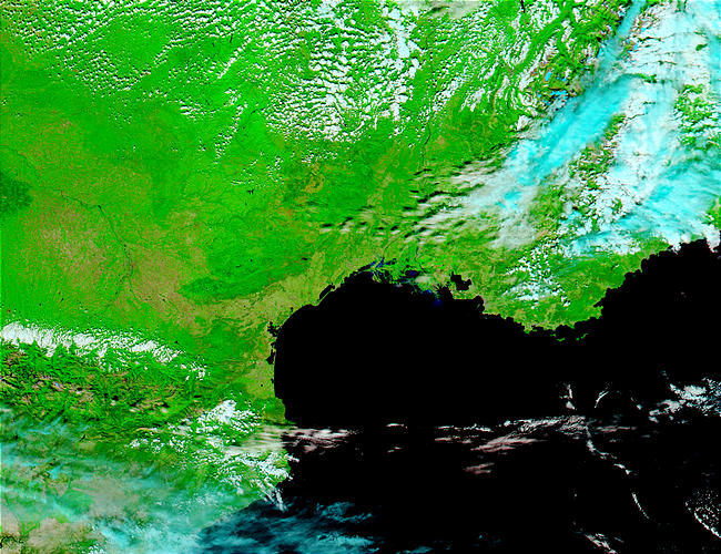 Silt displaced by the flooding is caught up in the waters of the Rhone and are deposited into the Golfe du Lion. The silt appears brown-green in the true-color imagery because of the way that sunlight reflects off of it, and its pattern of streaks and clouds is due to currents in the water. Eventually, after the flooding stops carrying so much silt to the Golfe, the silt will disperse and the waters will return to their predominantly blue-black color.