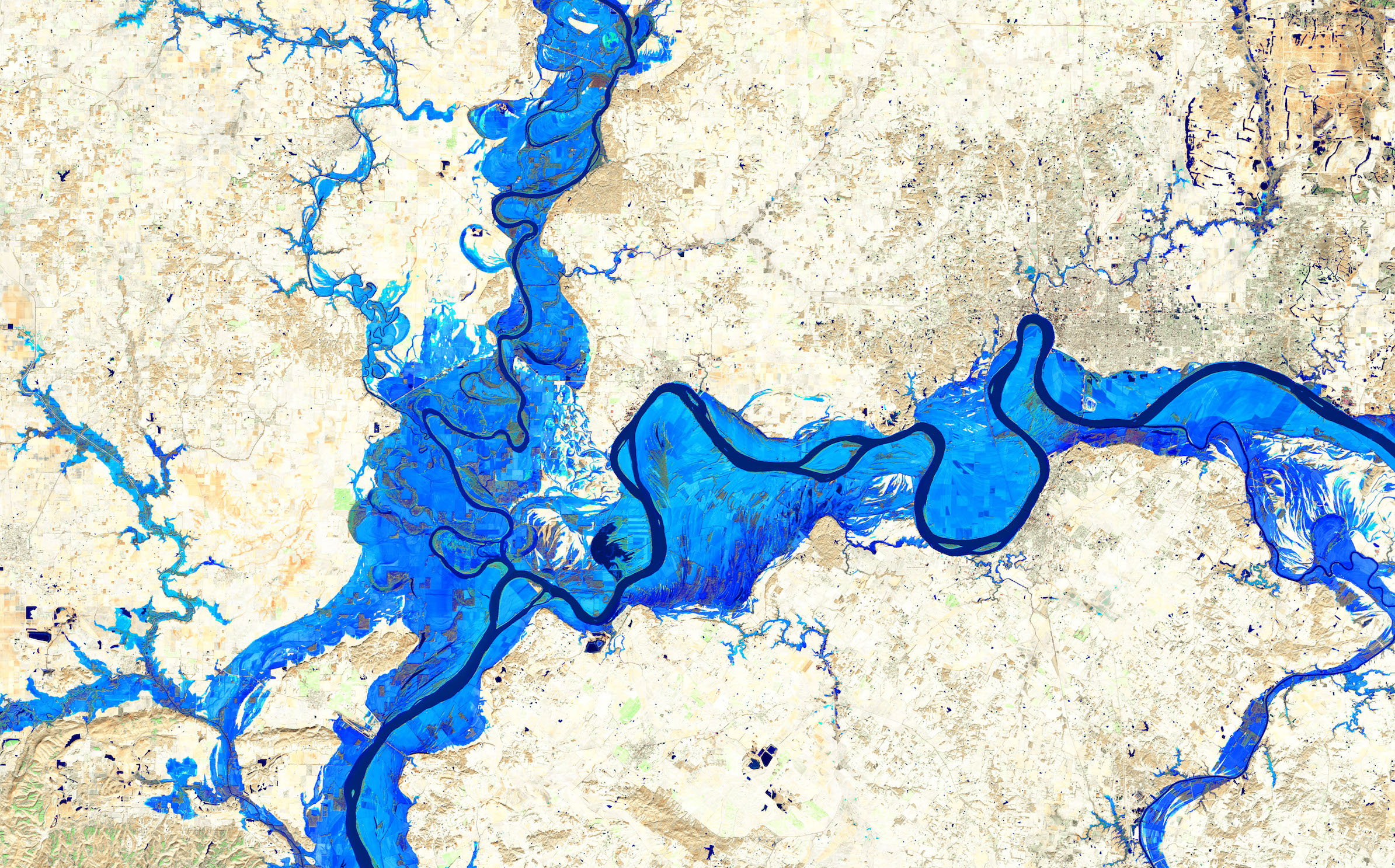 Today’s Image of the Day comes from the NASA Earth Observatory and features a look at floodwaters at the junction of the Ohio and Wabash Rivers. This composite image was acquired by the Operational Land Imager (OLI) on board the Landsat 8 satellite and combines one image taken of the flooding on March 3, 2018 with an image taken on November 7, 2017 that shows the normal width of both rivers.
