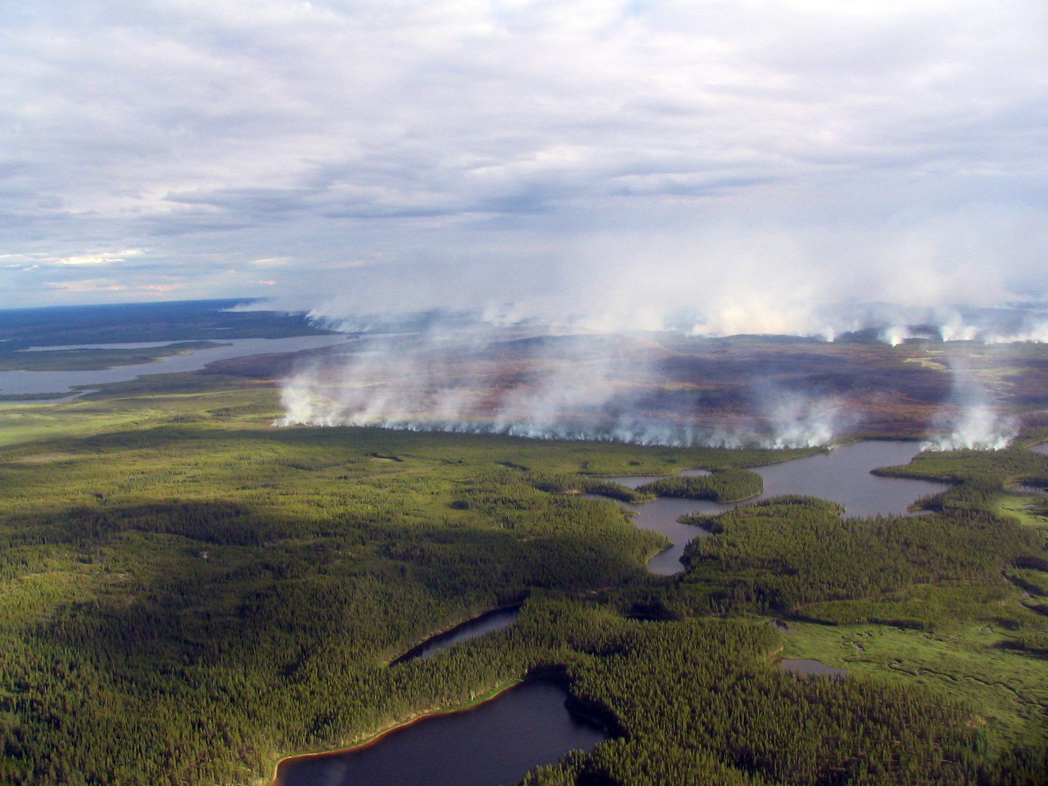 Smoke plumes from forest fires are interspersed among Canada’s numerous lakes. The fires, ignited mainly by lightning strikes, have increased in number over the last decade. Credit: NASA