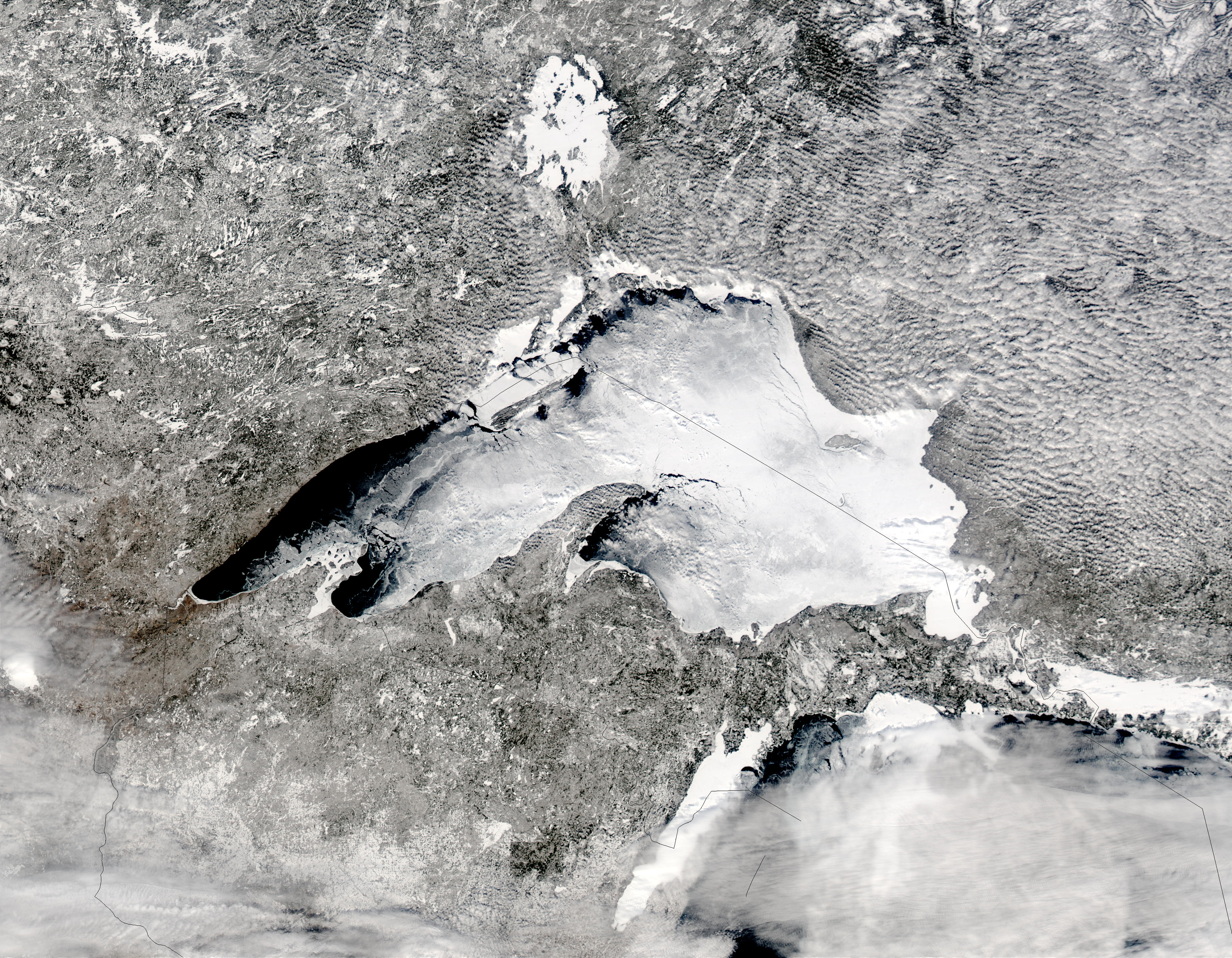 The ice on Lake Superior was up to two feet thick in some places, necessitating the use of ice-breaking ships to open shipping lanes for the beginning of the shipping season. Some key shipping locations, such as the St. Lawrence Seaway (not shown), which connects the Great Lakes to the Atlantic Ocean, have already had their openings delayed. The other Great Lakes— Erie, Huron, Michigan, and Ontario—were also affected by ice cover, though to lesser extents.