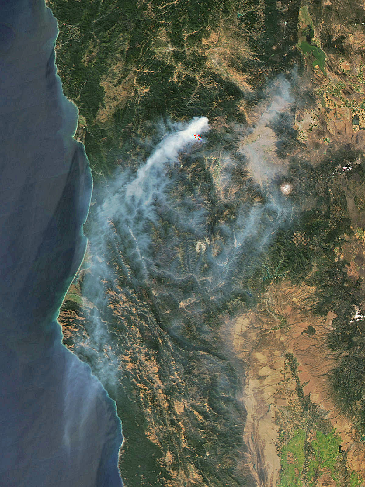 The Moderate Resolution Imaging Spectroradiometer (MODIS) aboard NASA’s Aqua satellite captured a true-color image of the Gap Fire on September 5. Red outlines mark “hotspots” where the thermal bands on the instrument detected high temperatures. Smoke pours from the hotspots and is blown in several directions from the actively burning areas – evidence of the erratic nature of the winds in the region.