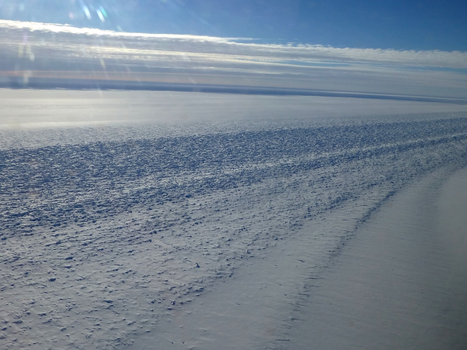 View of a glacier shear margin seen from the NASA DC-8 on the Nov. 1 survey of the Ronne Ice Shelf grounding line. Therefore margin is the point where fast-flowing glacier ice meets slow-moving ice or rock (in this case, ice attached to the Dufek Massif in Antarctica’s Pensacola Mountains). Credit: NASA / Maria-Jose Viñas