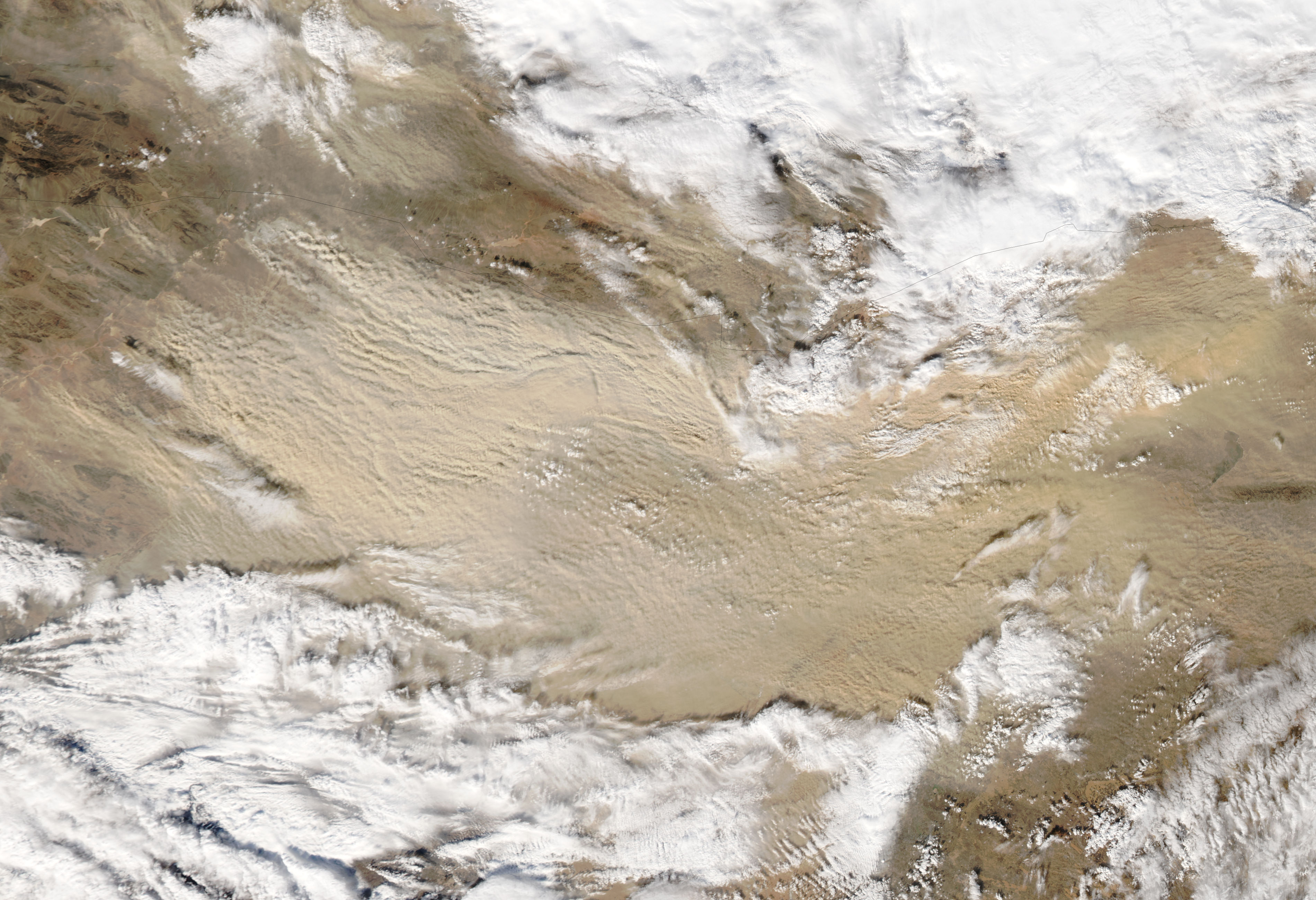 A dust storm that blew through Asia’s Gobi Desert on November 10, 2010, quickly intensified as the day wore on. When the Moderate Resolution Imaging Spectroradiometer (MODIS) on NASA’s Aqua satellite captured this image at 1:50 p.m. Beijing time (5:50 UTC), the dust plumes were considerably thicker than they had been just two hours earlier. Smaller dust plumes also appeared north of the Mongolia-China border.