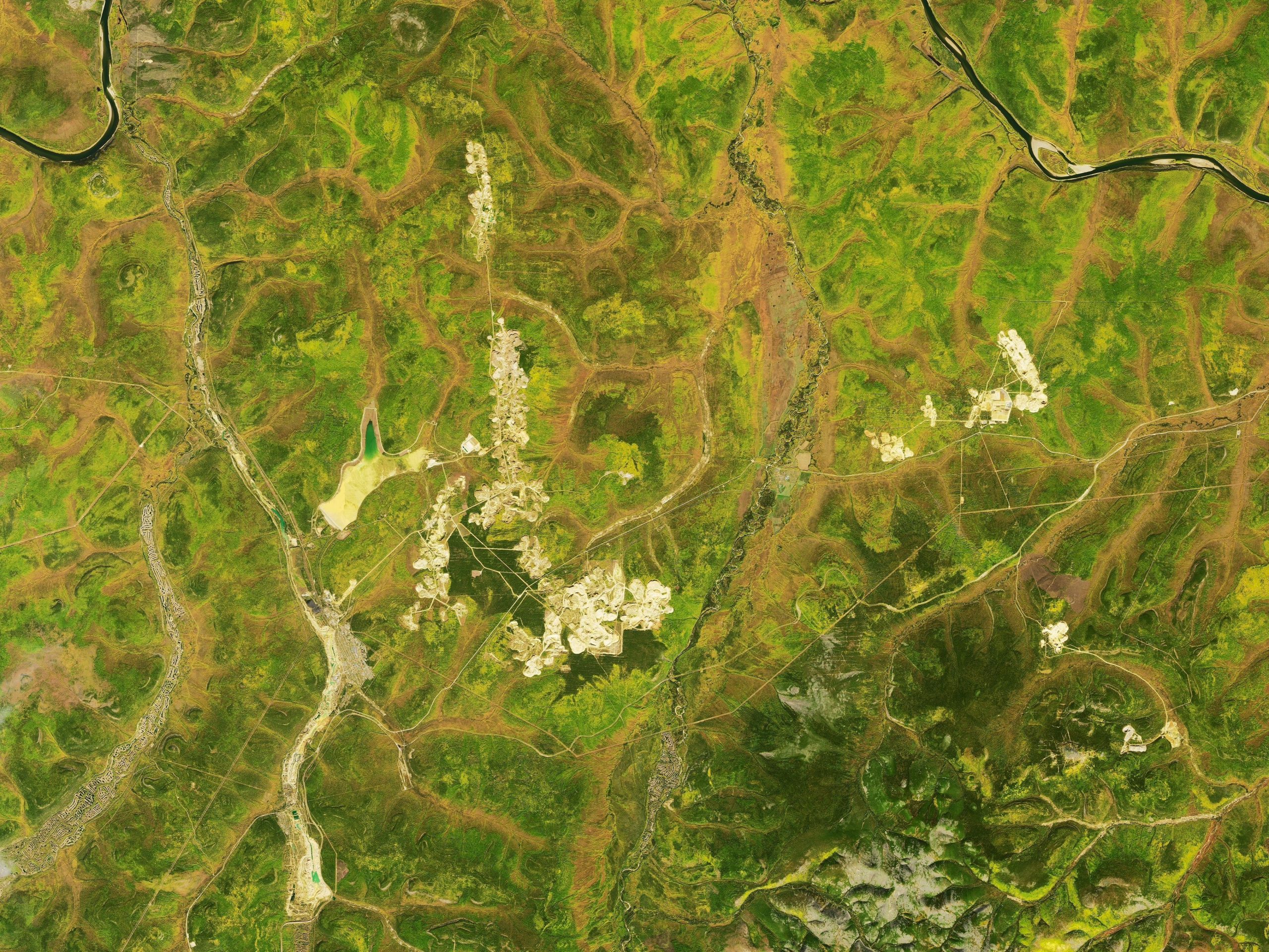 The photograph shows part of the ore district in the Republic of Sakha about 25 kilometers northwest of the gold-mining town of Aldan, which is one of Russia’s largest gold ore districts.