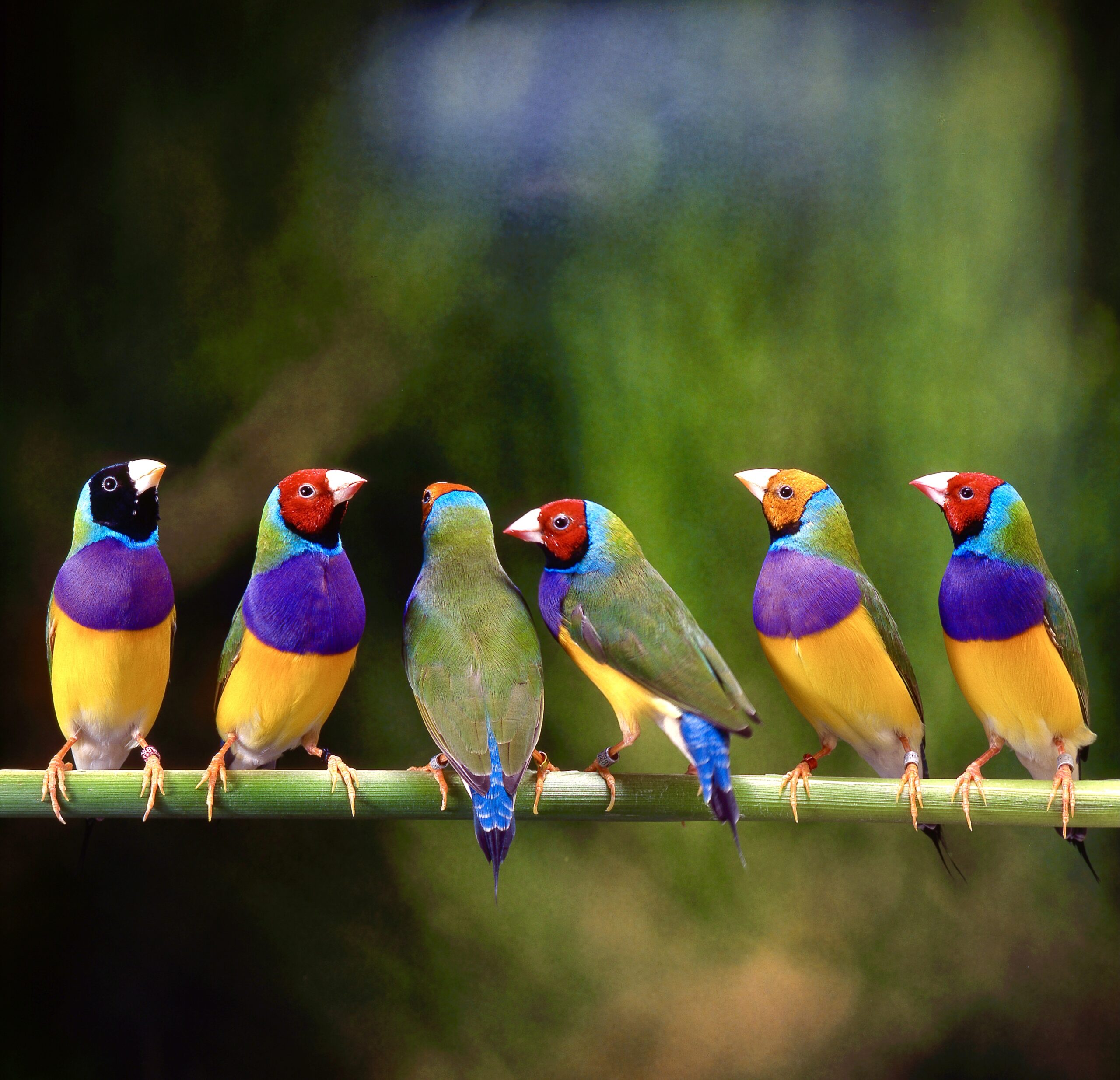 Native to Australia, the gouldian finch has distinctive green, yellow, red, and black markings. The males have a bright purple chest, while the female’s chest is a lighter shade of mauve.