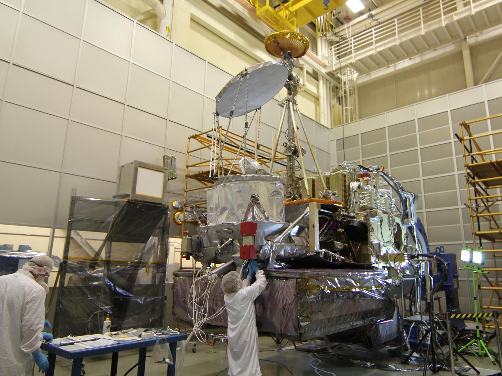 GPM Completes First Dry Run. Engineers check on the GPM spacecraft after successful completion of its first comprehensive performance test. The silver disc and drum (center) is the GPM Microwave Imager, and the large block on the base is the Dual-frequency Precipitation Radar. The tall golden antenna is the High Gain Antenna for communications.