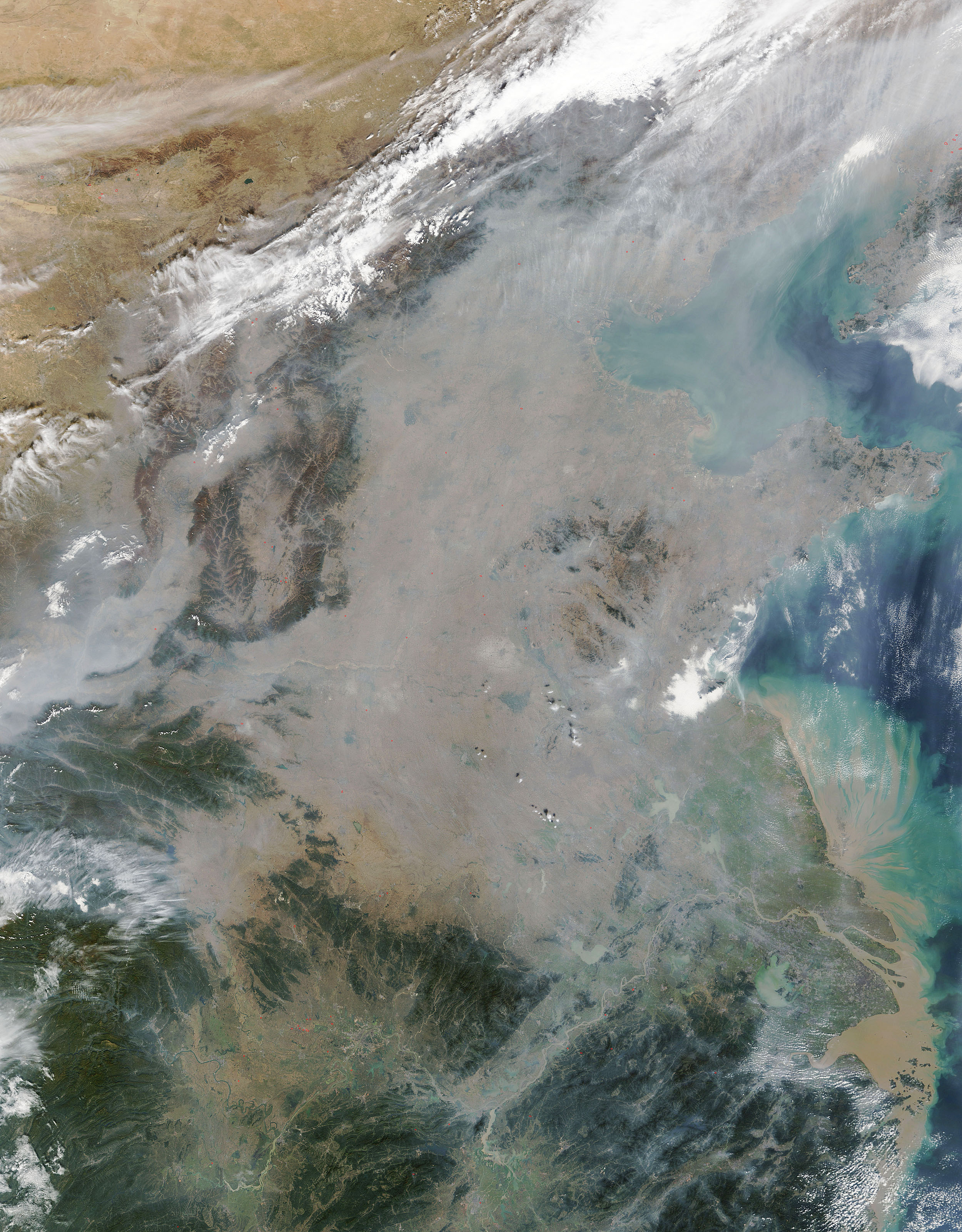 On October 17, 2015, Haze Hanging Over Eastern China the Moderate Resolution Imaging Spectroradiometer (MODIS) aboard NASA’s Terra satellite captured this true-color image of a thick haze hanging over eastern China. In the north, the large city of Beijing is completely obscured from view, as is much of the landscape. The haze thins slightly over the Bohai Sea. Further south, sediment pours into the East China Sea near the city of Shanghai.