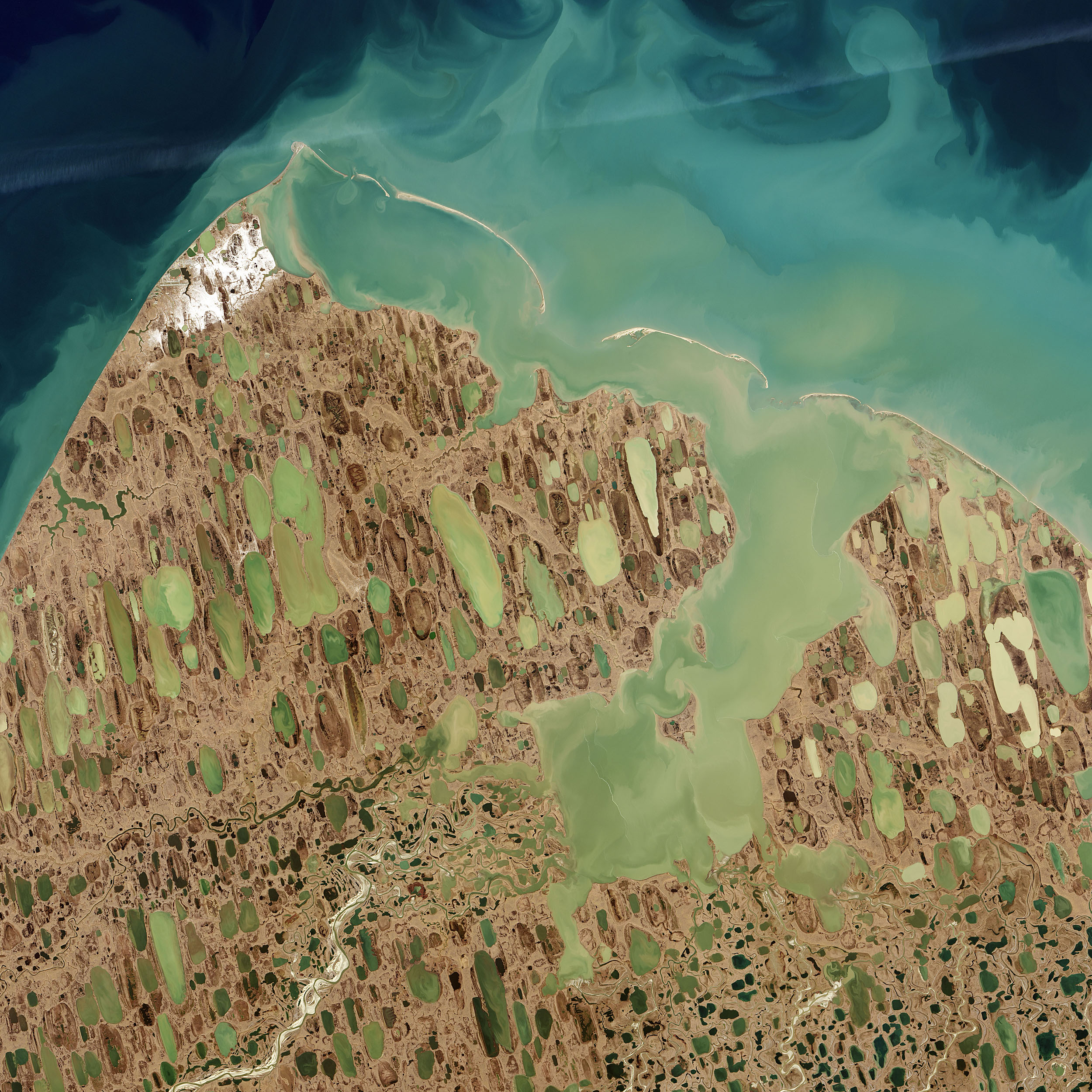 Looking at natural-color Landsat imagery of this area, no shoal jumps out to the naked eye. The image above was acquired by the Operational Land Imager on Landsat 8 on September 6, 2014, and it captures the swirling sediments typical of the North Slope and Elson Lagoon. Those suspended sediments block most of the light that would normally be reflected by the seafloor.