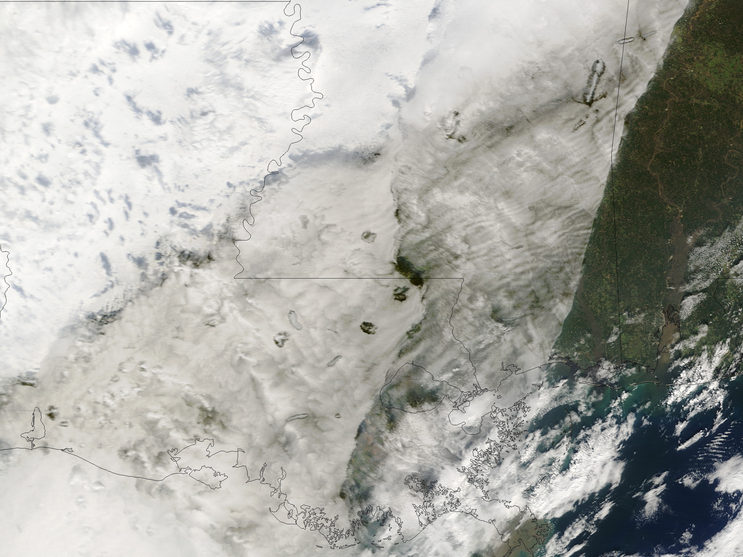 Supercooled water droplets play a key role in the formation of hole-punch and canal clouds, the distinctive clouds shown in this satellite image. Hole-punch clouds, which are also called fallstreak clouds, usually appear as circular gaps in decks of altocumulus clouds; canal clouds look similar but the gaps are longer and thinner. The natural-color image shows hole-punch and canal clouds over Mississippi and Louisiana, as observed on December 29, 2015, by the Moderate Resolution Imaging Spectroradiometer (MODIS) on NASA’s Terra satellite.