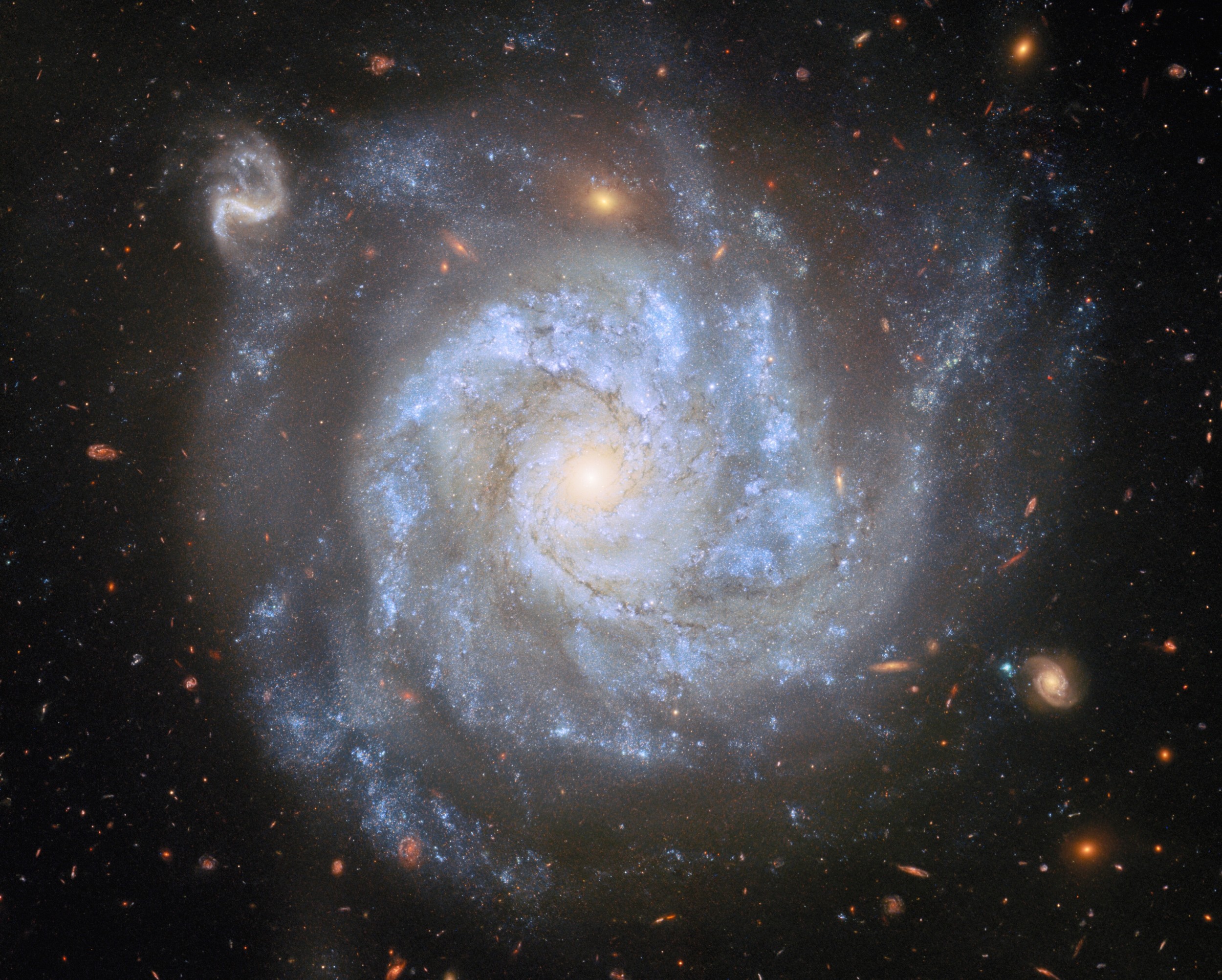 The new view captures the galaxy in exquisite detail. Its blue arms are full of young stars. The galaxy’s glowing white core is surrounded by hundreds of distant galaxies scattered across space.
