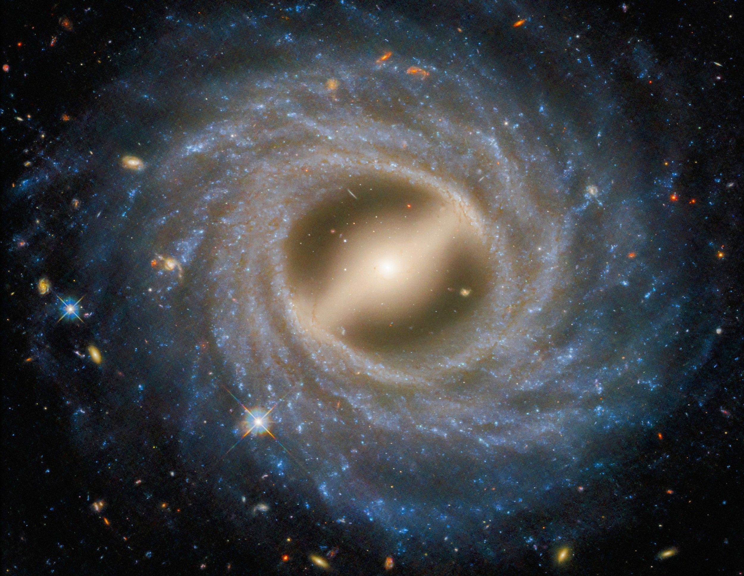 “A notable bar structure slices across the center of the galaxy. The bar channels gas inwards toward the galactic center, fueling star formation.”