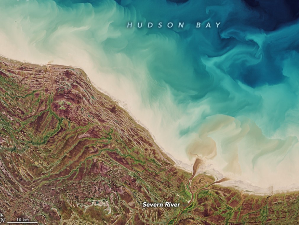 The Hudson Bay receives fresh water from more than 40 major rivers. As sediment and dissolved organic matter mix in from various types of ecosystems, the color of the bay’s salty water is changed.