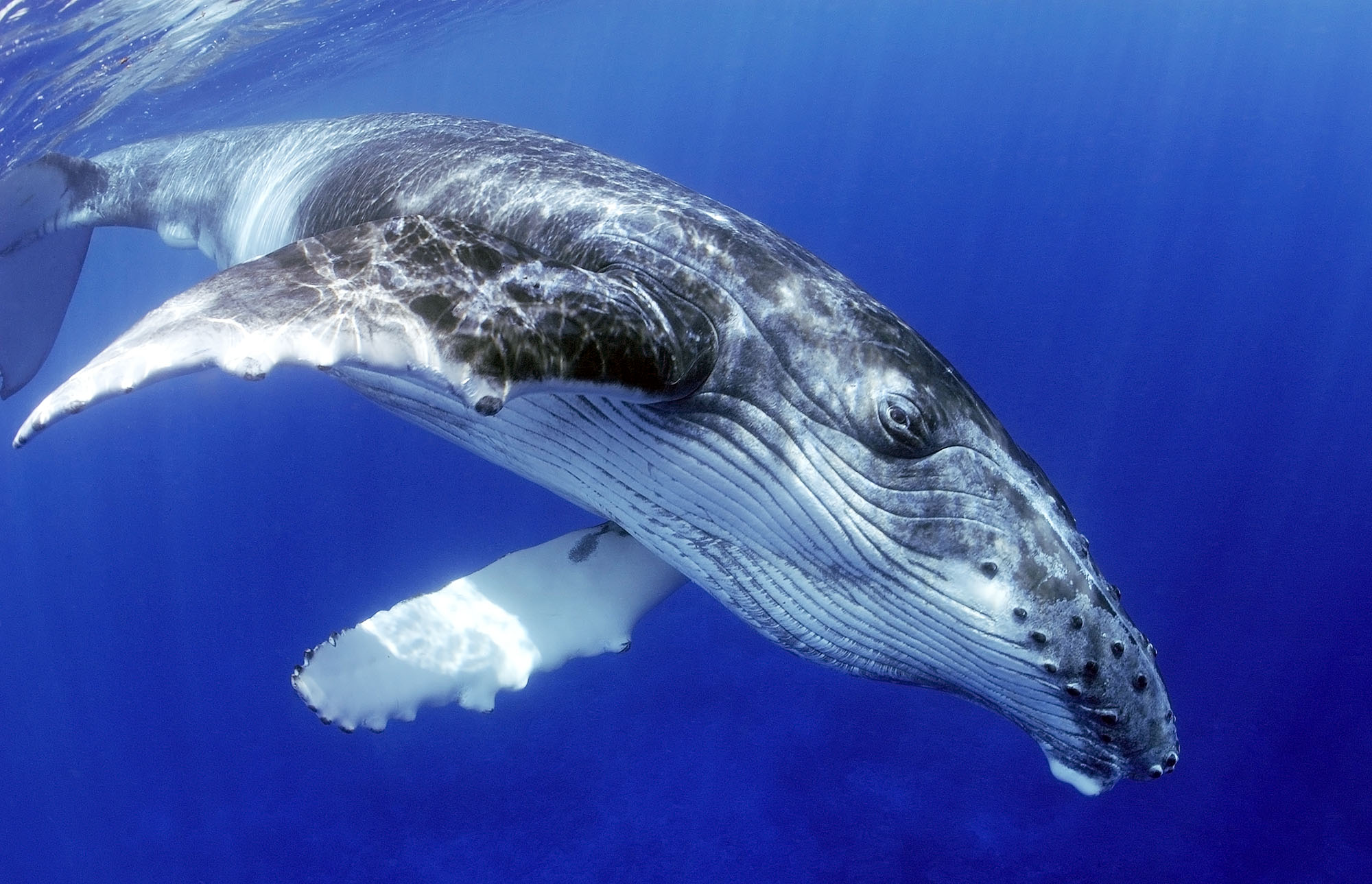 Found in oceans and seas around the world, humpback whales typically migrate up to 16,000 km (9,900 mi) each year. They feed in polar waters and migrate to tropical or subtropical waters to breed and give birth. Their diet consists mostly of krill and small fish.