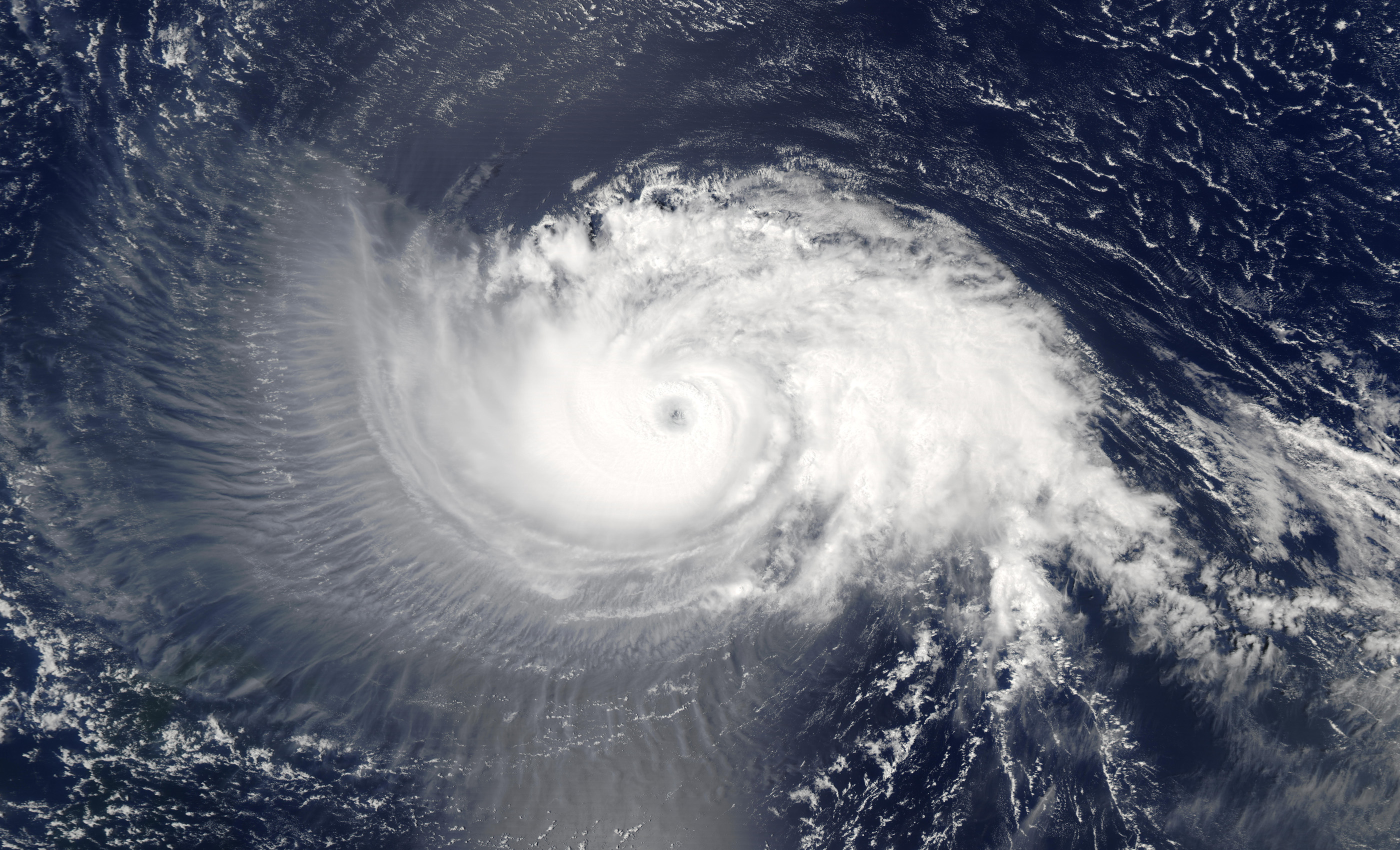 Hurricane Isabel, North Atlantic Ocean. The MODIS instrument onboard NASA’s Aqua satellite captured this true-color image of Hurricane Isabel, a powerful category 4 storm in the tropical Atlantic Ocean. At the time this image was taken on September 10, 2003, at 16:40 UTC, Isabel was packing maximum sustained winds of 135 mph with higher gusts. As evidenced by the thin cirrus clouds, this image indicates that outflow on Isabel’s western side is expanding towards the west (this divergence of high-altitude air is orchestrated by a high-pressure system that forms in the upper troposphere over the eye).