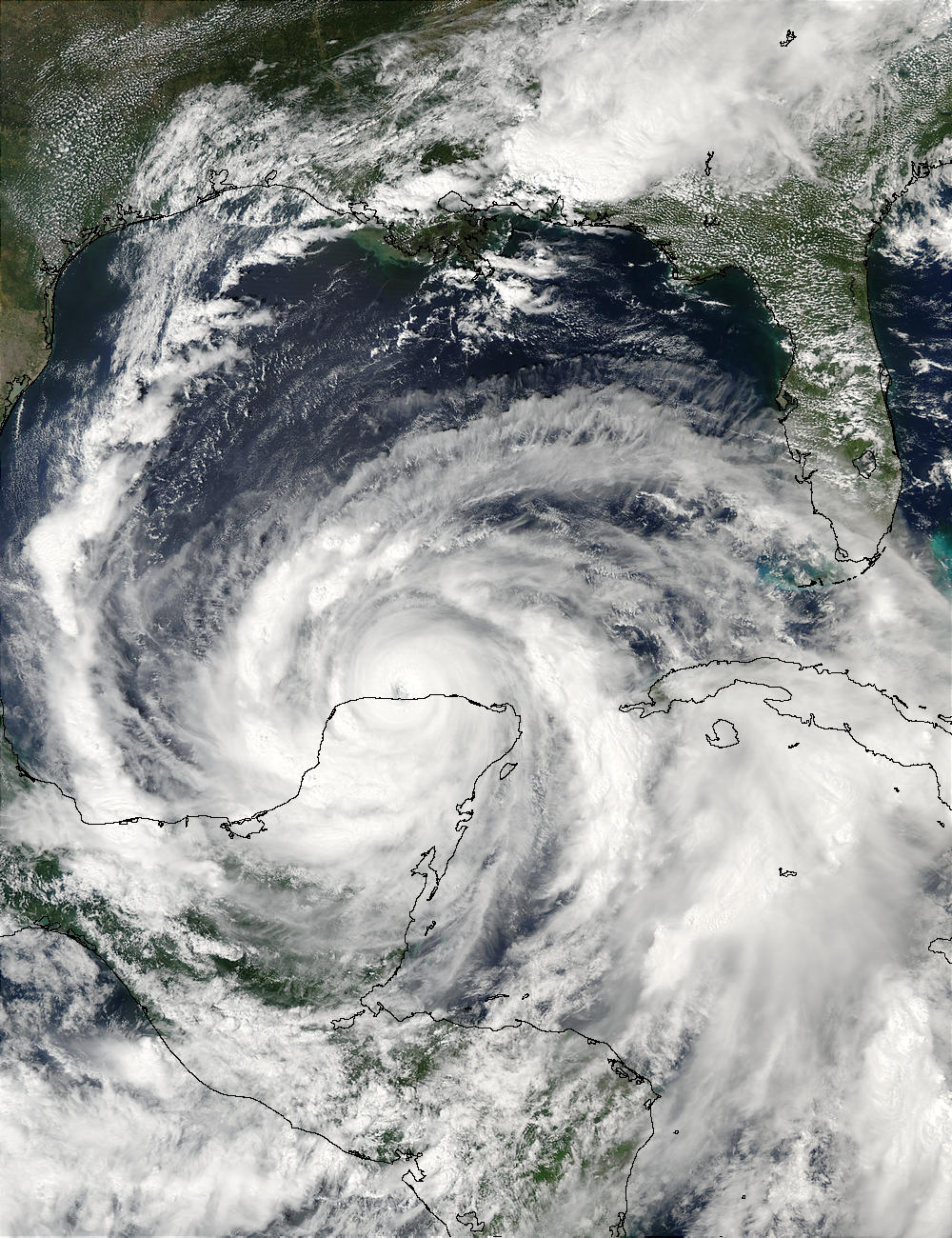 Hurricane Isidore hammers the Yucatan Peninsula. There as though even as it moves westward into the Gulf of Mexico. Also begins eyeing the Gulf Coast of the United States. In this true-color Moderate Resolution Imaging Spectroradiometer (MODIS) image from the Aqua satellite. Therefore large atmospheric circulation associated with the storm is easily seen. If the storm were centered in the Gulf, it would fill it completely. This iamge was acquired on September 22, 2002.