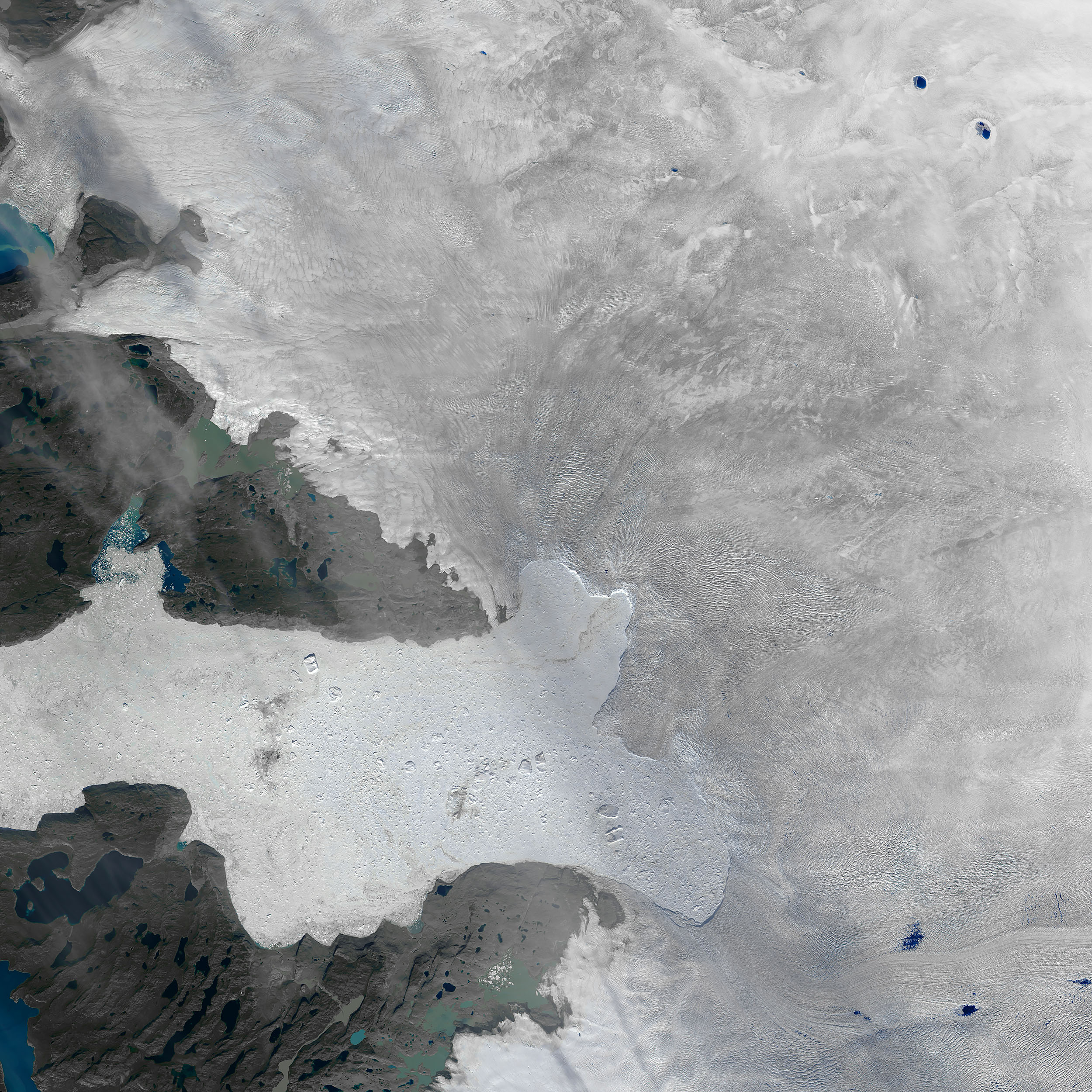 Summer is the season to watch for ice loss from the outlet glaciers lining the perimeter of Greenland. Jakobshavn Glacier — Greenland’s fastest-moving glacier — is notorious for such losses; in 2014 the glacier shed kilometers of ice from its front. In 2015, the glacier lost yet another large chunk of ice.