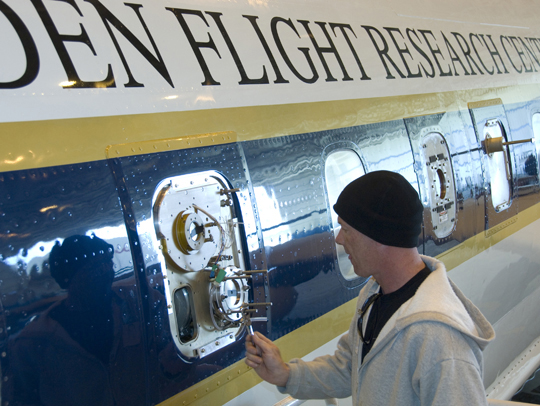 Lee Mauldin inspects the National Center for Atmospheric Research CIMS instrument probe on the exterior of NASA’s DC-8 flying lab prior to the ARCTAS mission. Credit: NASA