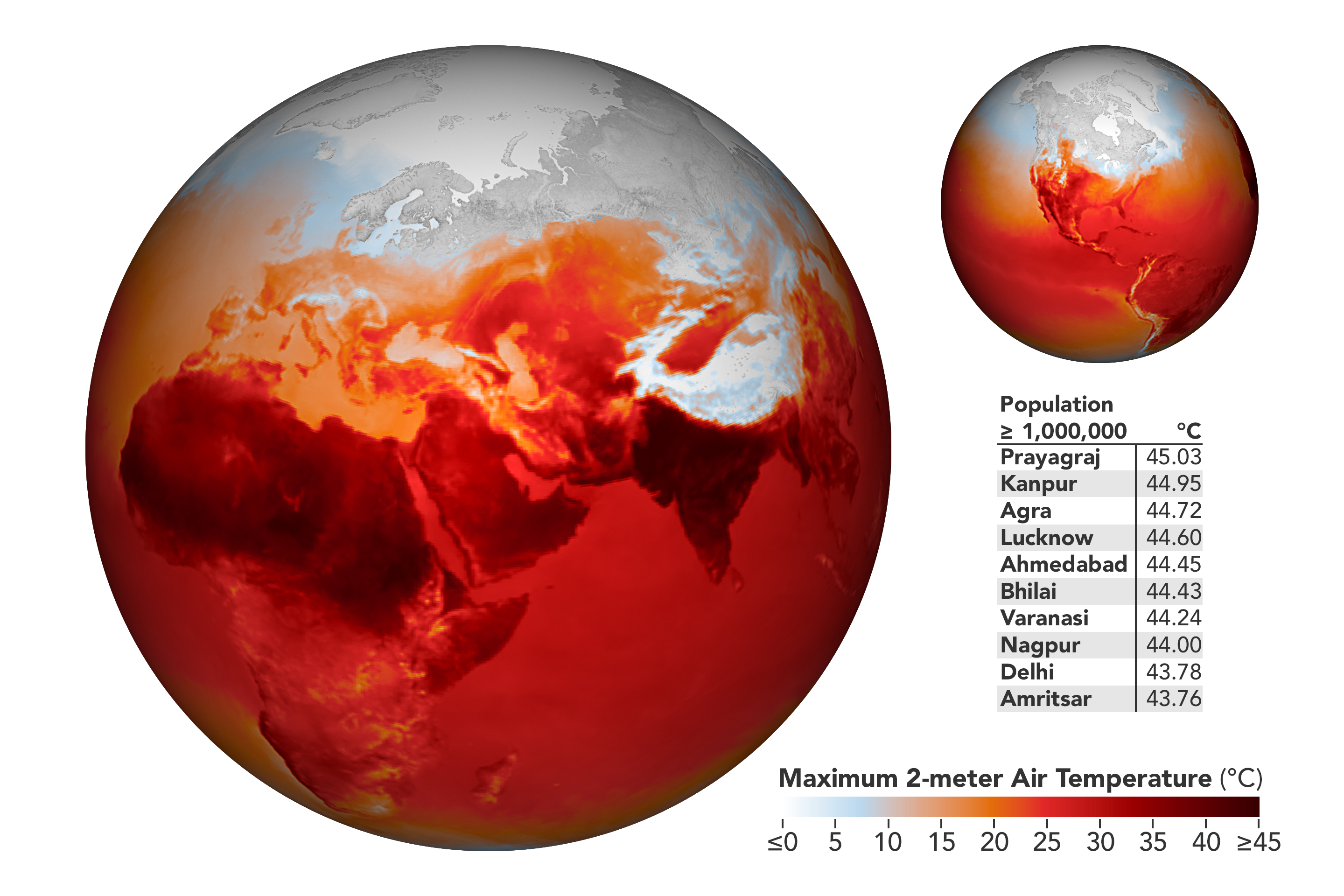 “On April 27, 2022, the highest temperature in the country, 45.9°C (114.6°F), was recorded in Prayagraj in Uttar Pradesh,” reports NASA. “The day before, a high of 45.1°C (113.2°F) was reported at Barmer in West Rajasthan in the northwest, according to the India Meteorological Department. Many other localities recorded temperatures of 42-44°C (108-111°F).”