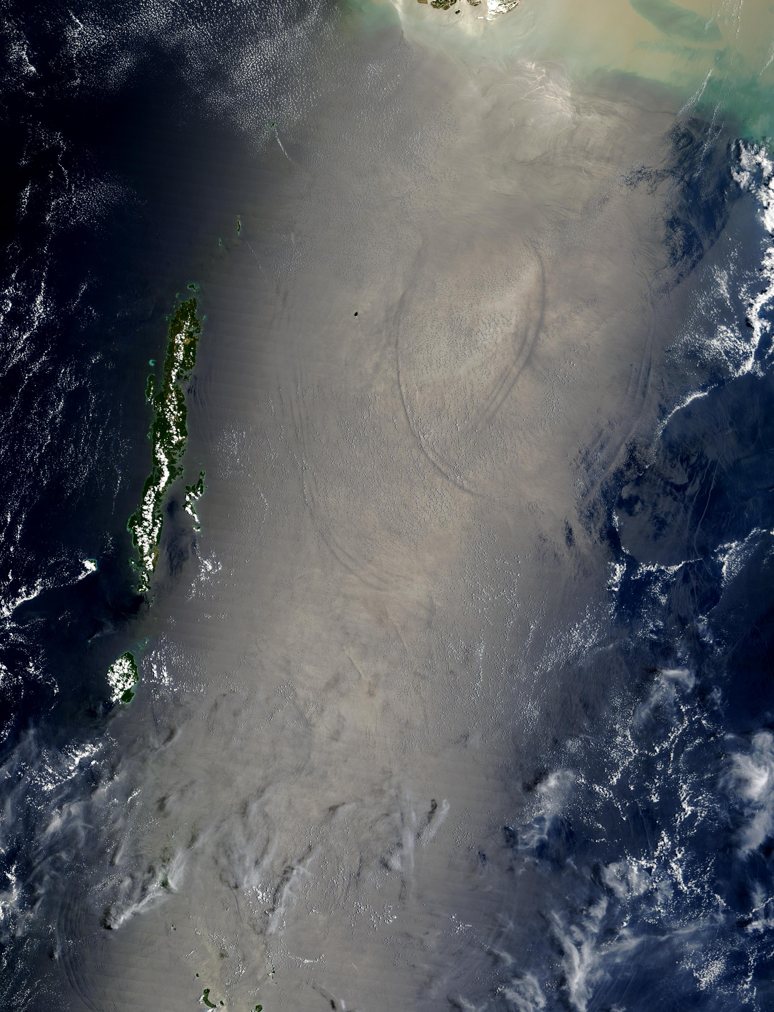 This true-color Aqua MODIS image was acquired on August 27, 2003. The large land-mass to the west is the northeastern point of Somalia, while the islands are part of Yemen.