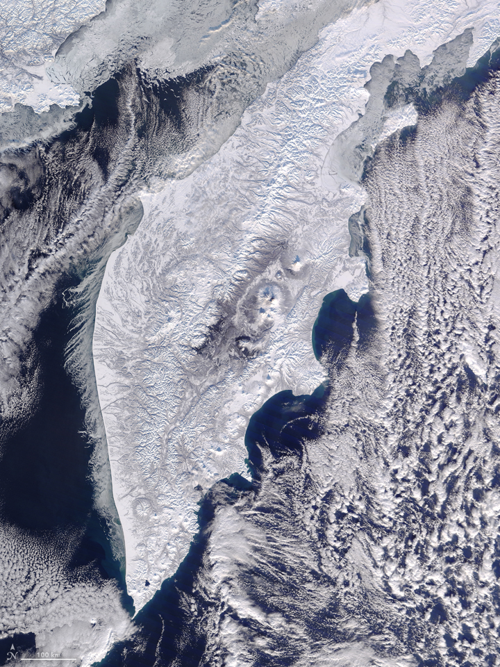 Kamchatka Peninsula in Russia is seen here covered in snow in this Image of the Day from the NASA Earth Observatory. The Kamchatka Peninsula is located in a remote part of the Russian Far East. It measures 780 miles in length, containing 100,00 square miles of land located in between the Pacific Ocean and the Sea of Okhotsk.