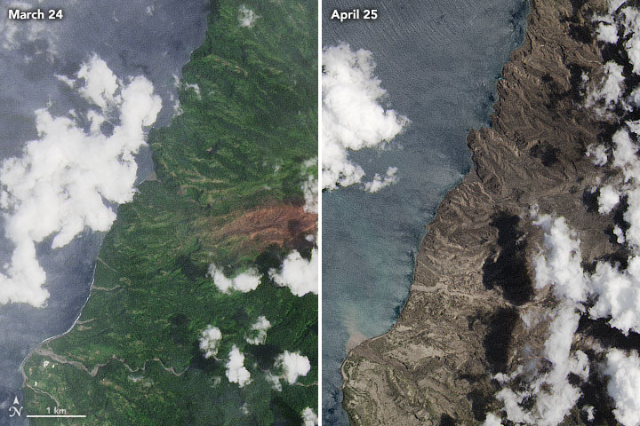 La Soufriére covers Saint Vincent in ash Today’s Image of the Day from NASA Earth Observatory shows the Caribbean island of Saint Vincent before and after two weeks of powerful eruptions by the La Soufriére volcano.