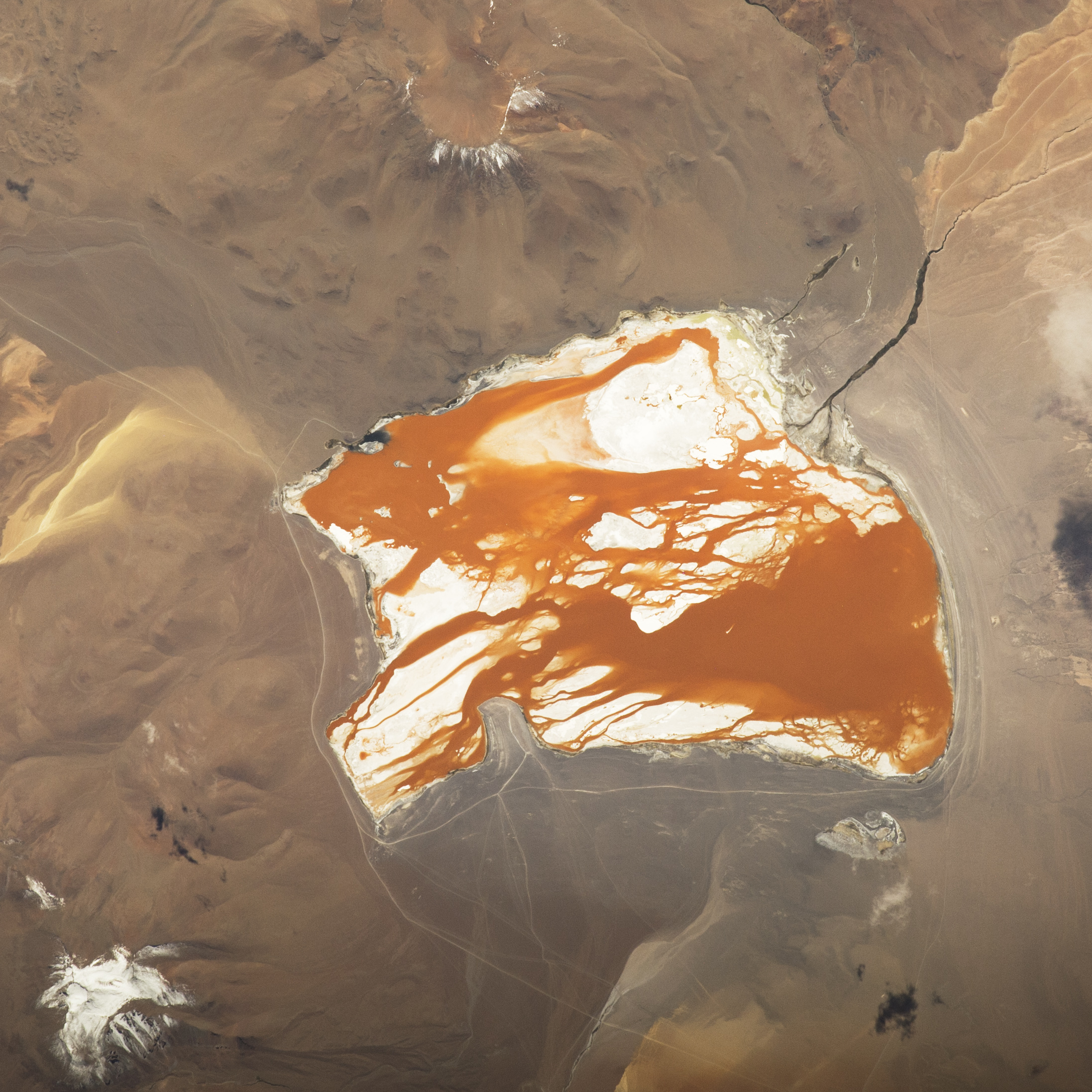 An astronaut aboard the International Space Station took this photograph of the brightly colored Laguna Colorada in the Bolivian Andes Mountains. The lack of atmospheric haze at high altitude—the lake sits 4,300 meters above sea level (14,100 feet)—helps make images of the region especially clear. NASA view in the image. Laguna Colorada is very ancient with a ton of history behind it.