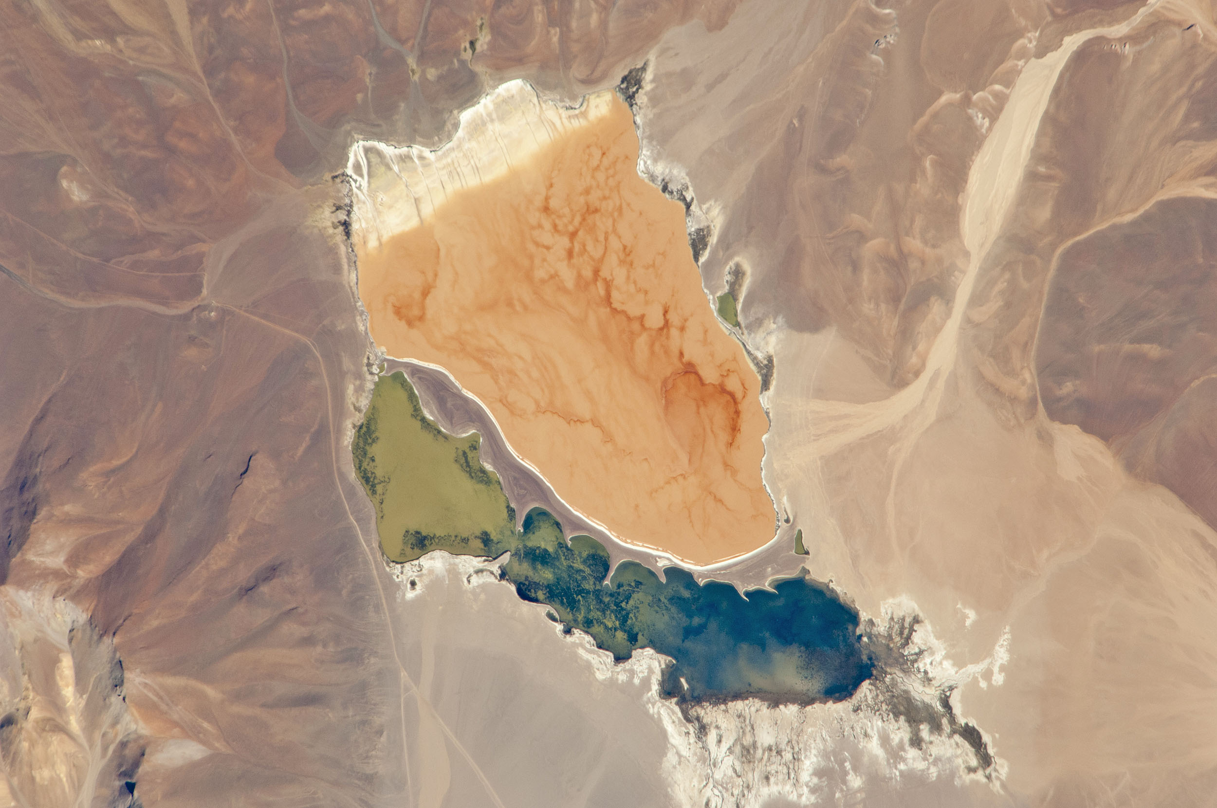 This image was taken by an astronaut aboard the International Space Station using a long lens. Its two contrasting colors are separated by a narrow bank of sand. Dry desert washes lead down from adjacent highlands, spreading out as alluvial fans on all sides of the lake.