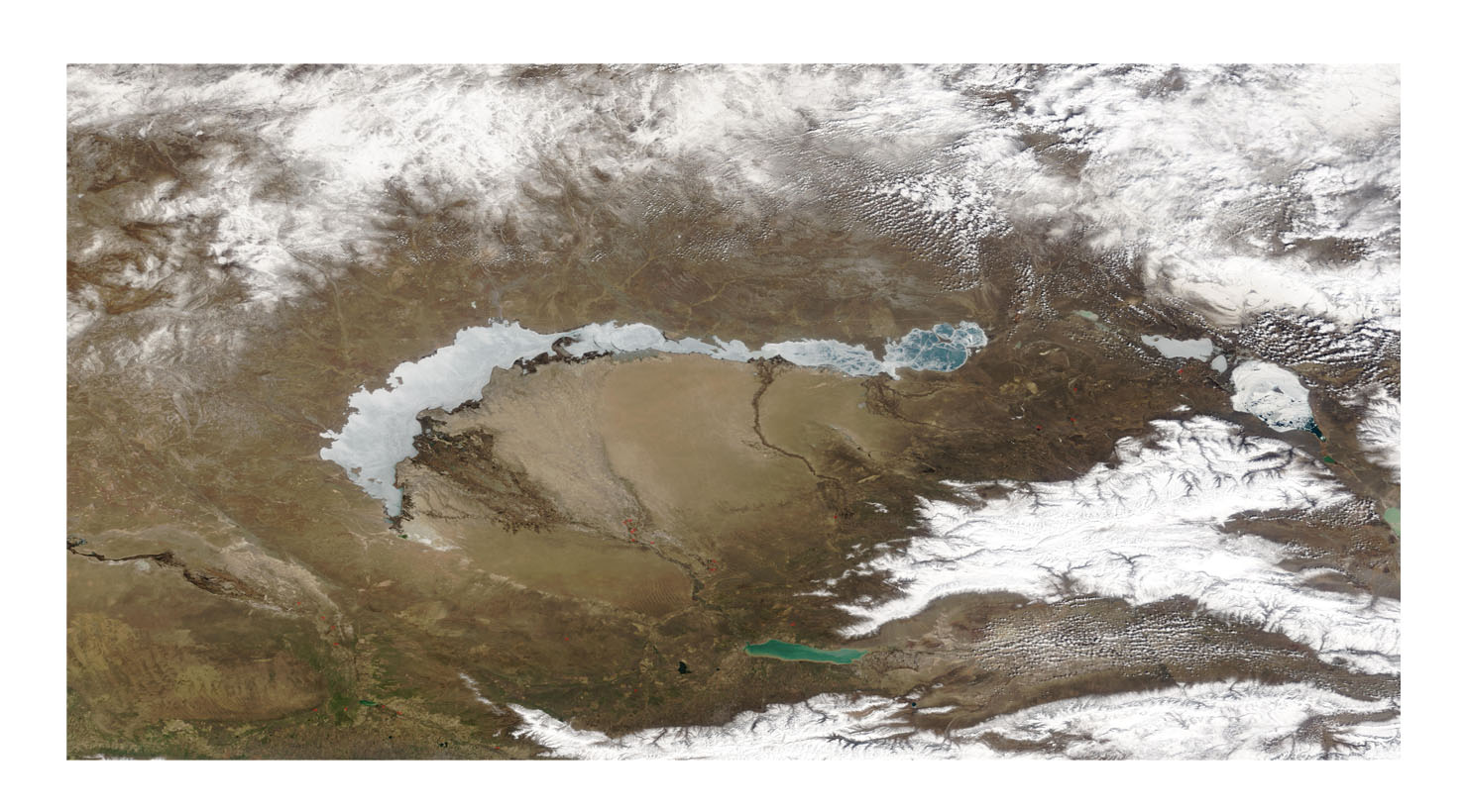 Lake Balkhash, Kazakhstan.This series of images from the Moderate Resolution Imaging Spectroradiometer (MODIS). Also on the Terra and Aqua satellites shows the break up and melting of seasonal ice in Lake Balkhash in southeastern Kazakhstan. The crescent-shaped lake is fresh water in the western half and saline in the east. The Ili River feeds the freshwater end, the Karatol flows in east of center, and the Aksu and Lepsy Rivers flow in at the eastern end. At the lower right of the images are the snow-covered peaks of the foothills of the Tien Shan Mountains. In several images, fires have been detected and are marked with red dots. The series of images runs from early April through May 2003.