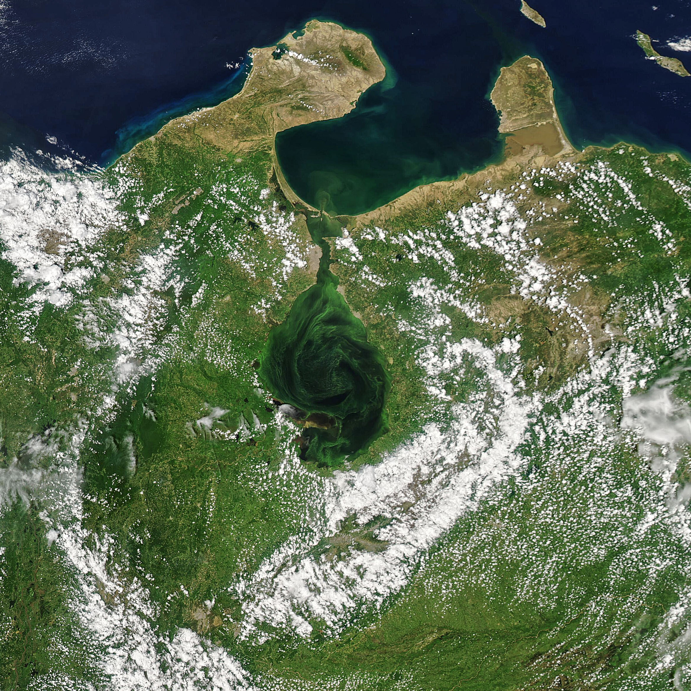 Today’s Image of the Day from NASA Earth Observatory features Lake Maracaibo, where pollution from leaking oil and excess nutrients has transformed the water.