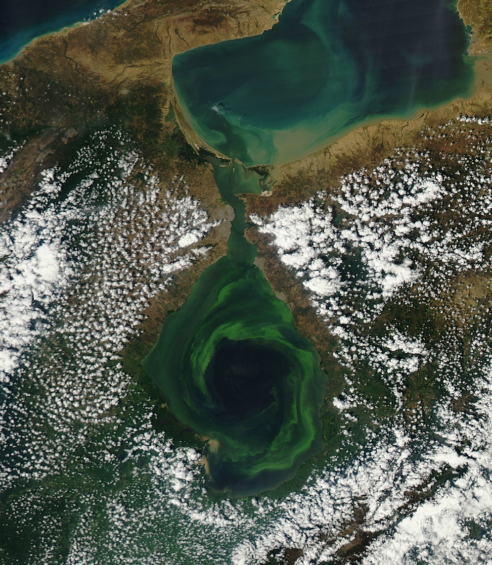 Lake Maracaibo in Venezuela, and a swirling emerald vortex, is seen here in this Image of the Day from NASA’s Earth Observatory. The green color is due to floating vegetation like duckweed suspended in Lake Maracaibo. Lake Maracaibo is connected to the Caribbean Sea by a narrow straight that’s only 4 miles wide and 25 miles long.