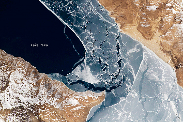 Today’s Image of the Day from NASA Earth Observatory features Lake Paiku, a deep lake on the Qinghai-Tibet Plateau. The photograph is part of a series of wintertime images captured by astronauts on the International Space Station
