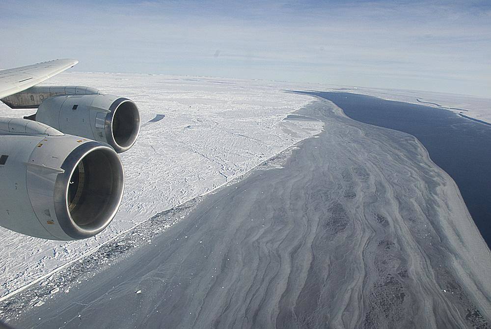 The edge of the Larsen Ice Shelf meets open water and sea ice, viewed from above during the 20th Ice Bridge flight in Antarctica. The flight, which lifted off on Nov. 16, 2009, surveyed the Antarctic Peninsula including the Larsen Ice Shelf and nearby glaciers. Credit: Michael Studinger, Lamont-Doherty Earth Observatory